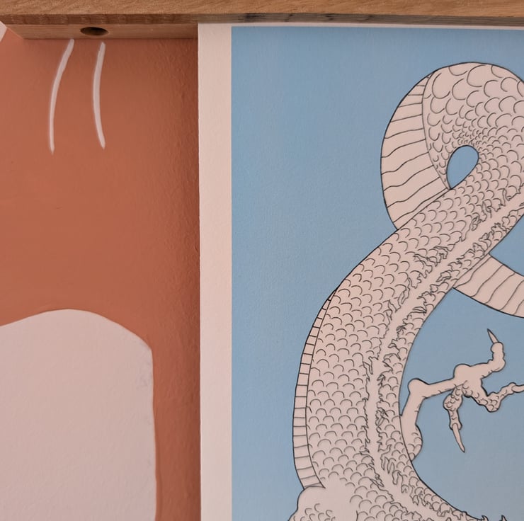 This was my first attempt and I'm really happy with how he's turned out. The dragon is hand drawn on paper which I then scanned in and added the colour digitally.