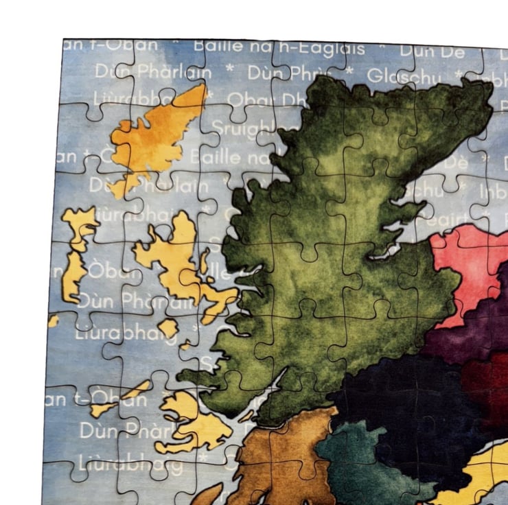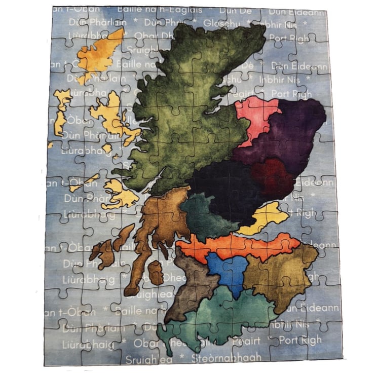 A wooden puzzle which uses a watercolour map of Scotland which has then been digitally edited to include the names of the main cities and towns of Scotland and the Islands in their Gaelic form.