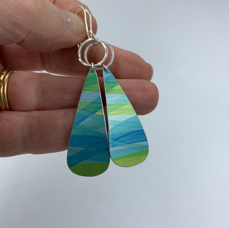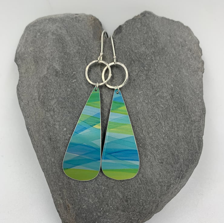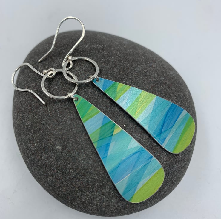 Blue and green striped drop earrings with silver ring