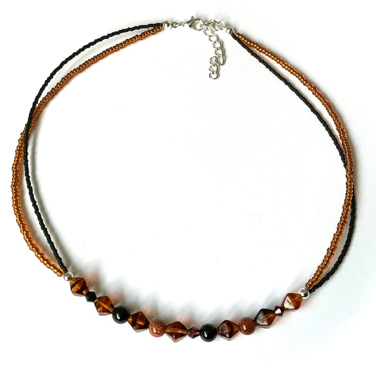 Twin strands of glass seed beads with a single centrepiece row of assorted beads using black onyx, Goldstone and glass.