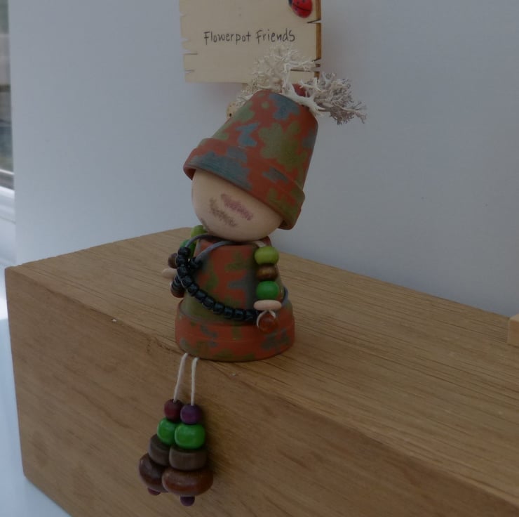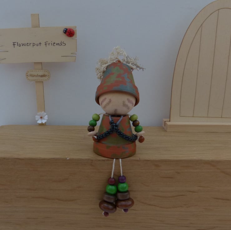 With a lovely camouflage design, mossy hat and glass bead bullet belt this lovely Flowerpot friend is always ready for action.