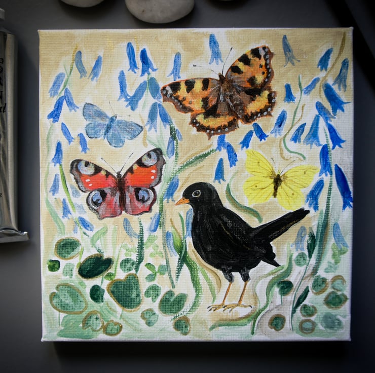 An original one of a kind spring painting on canvas depicting a blackbird, butterflies and bluebells.