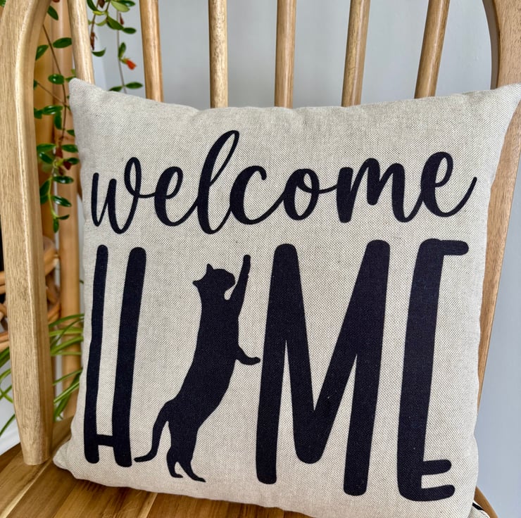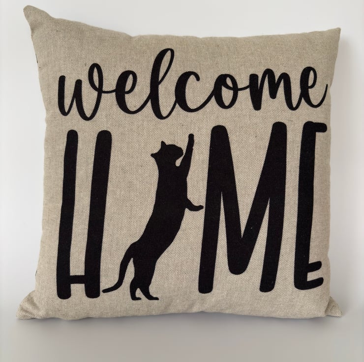 Perfect for cat lovers! Back cat design cushion cover with “Welcome Home” message.