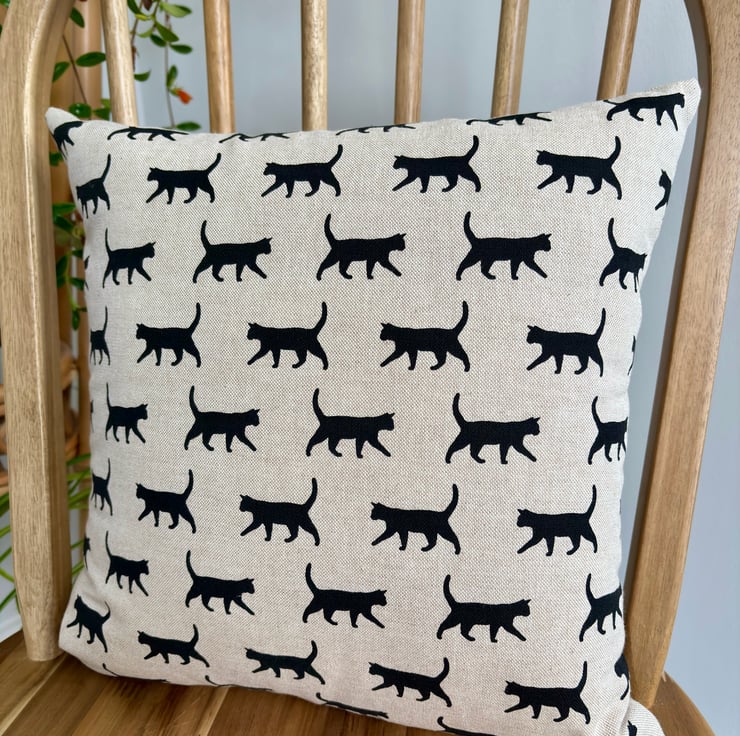 The cushion is backed with a coordinating design of black walking cats and is finished with an invisible zip. Both sides of the cover are made with a soft cotton rich linen look fabric.