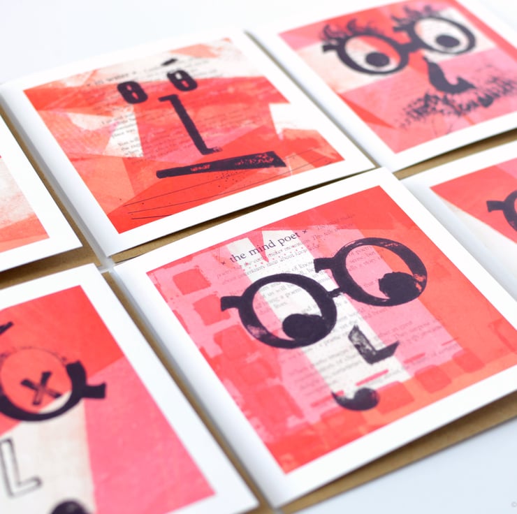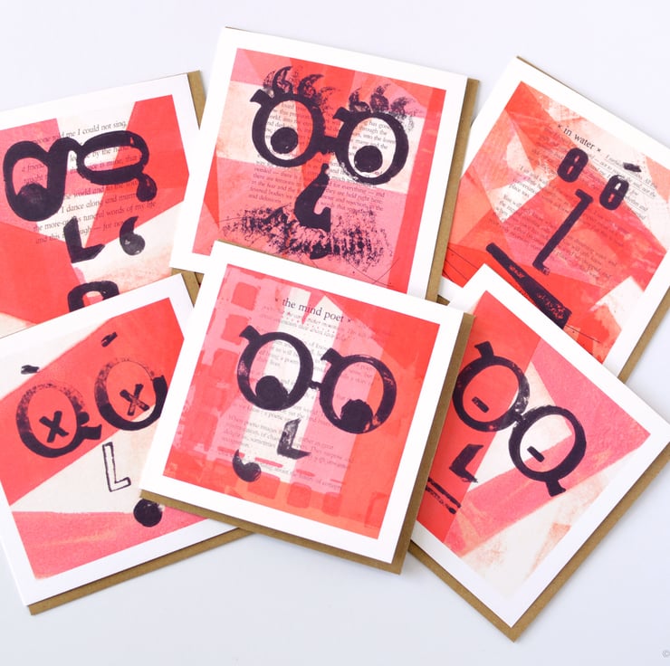 A Pack of 6 Cards of funny character designs created digitally from printed woodblock letters overlaid onto an original screen print.