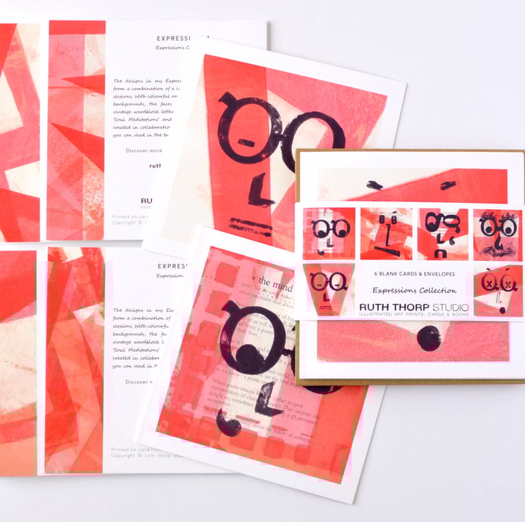 The designs in my ‘Expressions Collection’ are formed from the results of a couple of fun freestyle printing sessions. With colourful one-off screen prints forming the backgrounds, the faces were created separately using vintage woodblock letters printed onto book pages from ‘Soul Meditations’ and ‘Lifesongs’ – two publications created in collaboration with my dad Steve Thorp whose words you can read in the background of some of the designs.