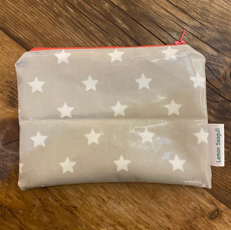 This make up bag is made from a grey oil cloth with white stars. The bag is lined with white cotton fabric and a pink zip.