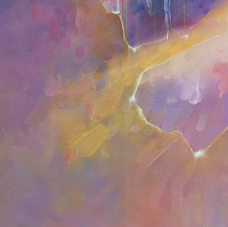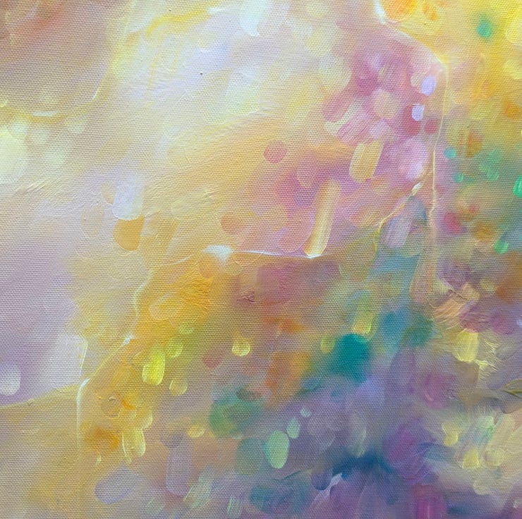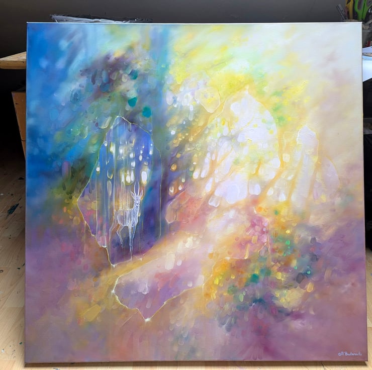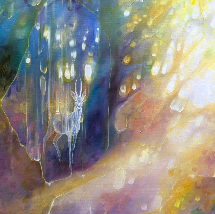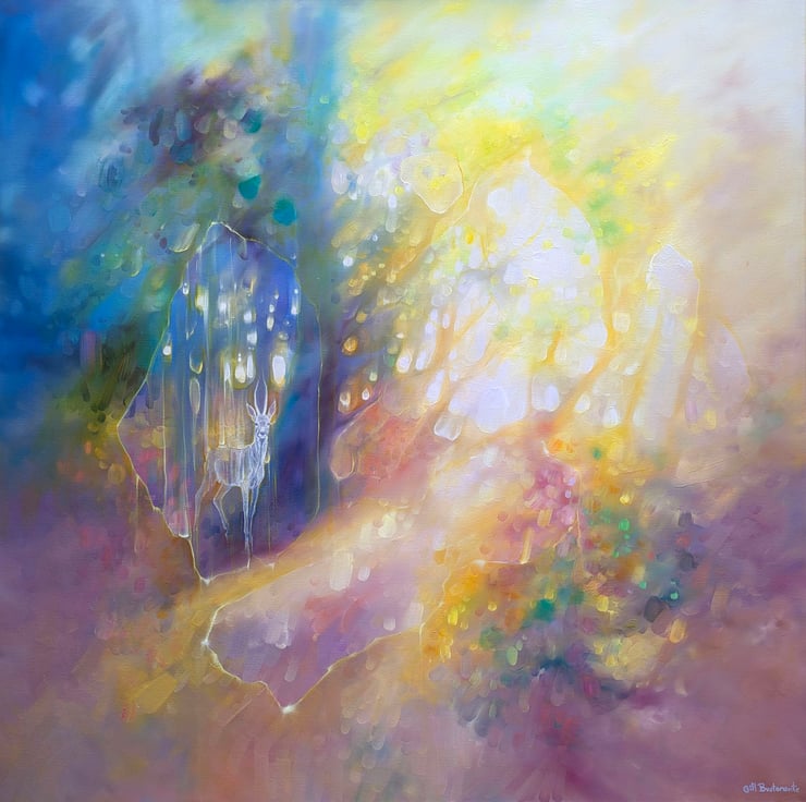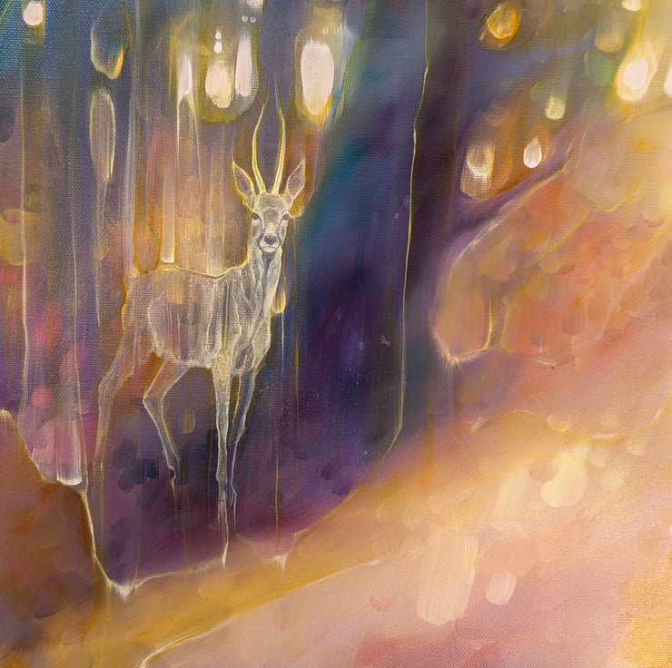 New Beginnings is an original oil painting in an ethereal semi-abstract style of a roebuck deer in a woodland glade. It is 36x36x1.5inches. The painting is vibrant and multi-coloured and hints at trees and leaves and dappled light in a spring forest. The roebuck is only half formed and it watching the viewer haughtily as roe deer tend to. Three shapes towards the centre of the canvas form tenuous portals or openings that could lead elsewhere. This painting was inspired by that exact idea. Often, especially in the ancient woodland copses of Sussex, I feel I could turn a corner and be in a whole new world. I like the idea – especially when I find a deer watching me (which is quite often in southern England). Anyone who walks in woodland will know the thrill of looking out from the trees to a clearing or a path beyond and that is the wonder of woodland and possibly one of the reasons so many fairy stories and folklore are founded in forests. Painted on deep edge canvas, ready to hang, no frame needed and comes with certificate of authenticity.