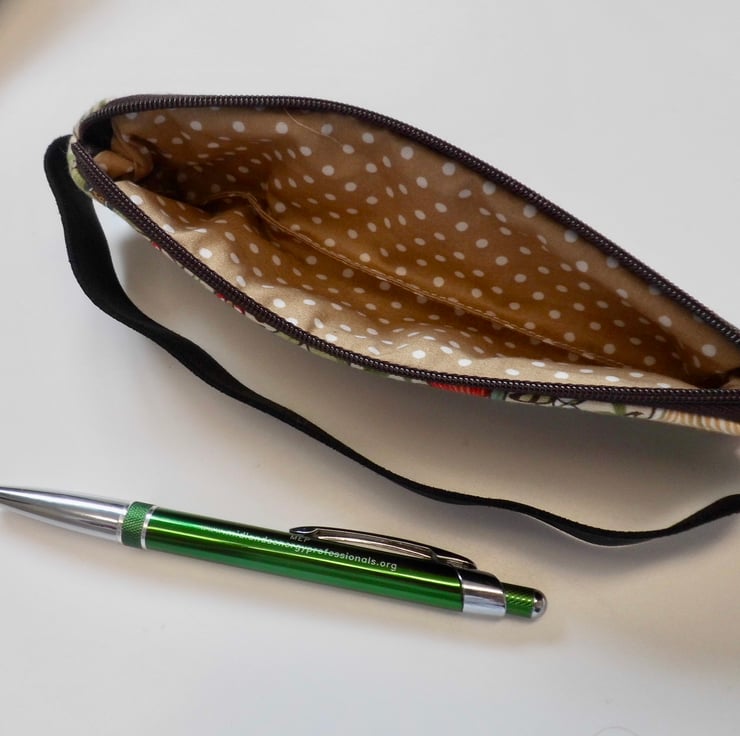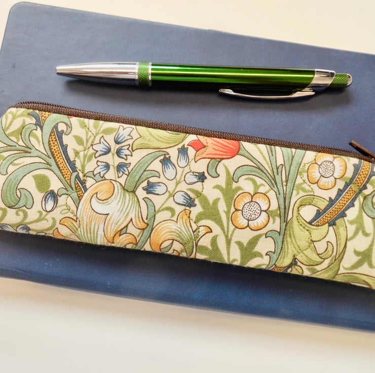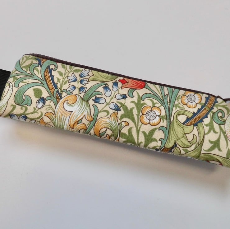 This one is made with a medium weight cotton fabric printed with William Morris' iconic Golden Lily design in red and green. I backed this fabric with fusible quilter's wadding and then machine stitched down each side with three rows of wave stitch to achieve a lightly quilted effect. The cotton lining is coffee colour with small spots.