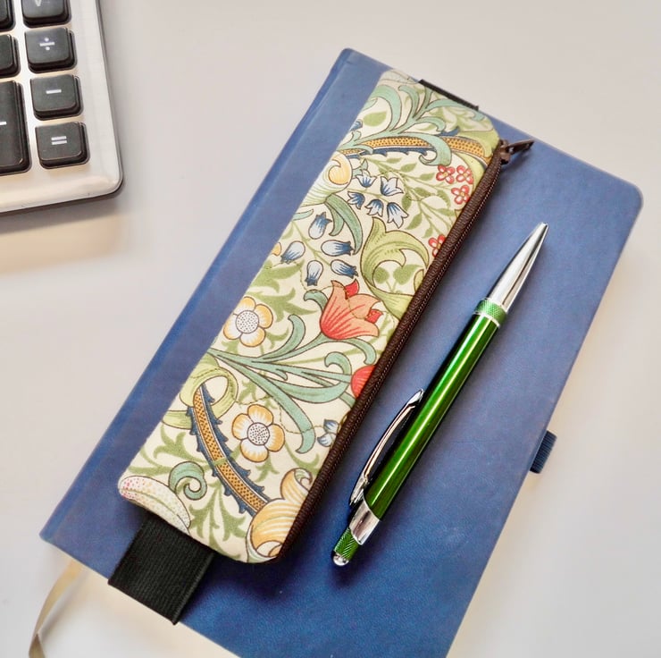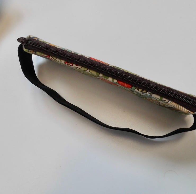 It has a brown zip across the top. The elastic is black and 23mm wide. The pencil case measures about 17.5 cm x 5 cm and I have shown it here on the cover of a book 21cm tall and it fits perfectly, although because it's elastic it will fit a book perhaps a couple of centimetres bigger.