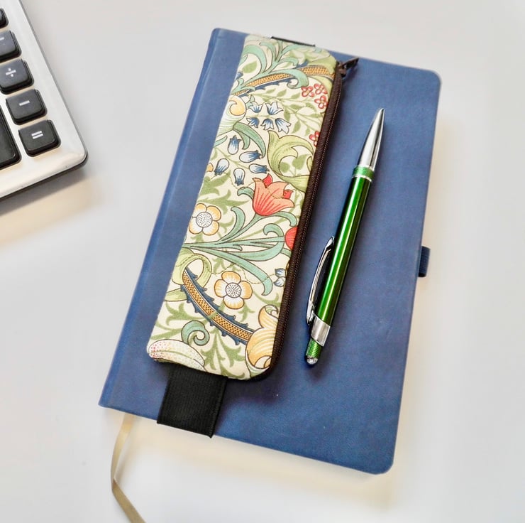 A mini pencil case designed to be kept on the front cover of your diary or journal, held in place with an elastic strap. Just slip it on the front cover and you can always have a pen and pencil to hand. Add it to whichever notebook you are using for the day.