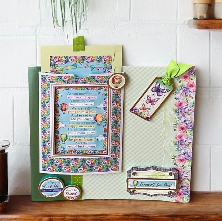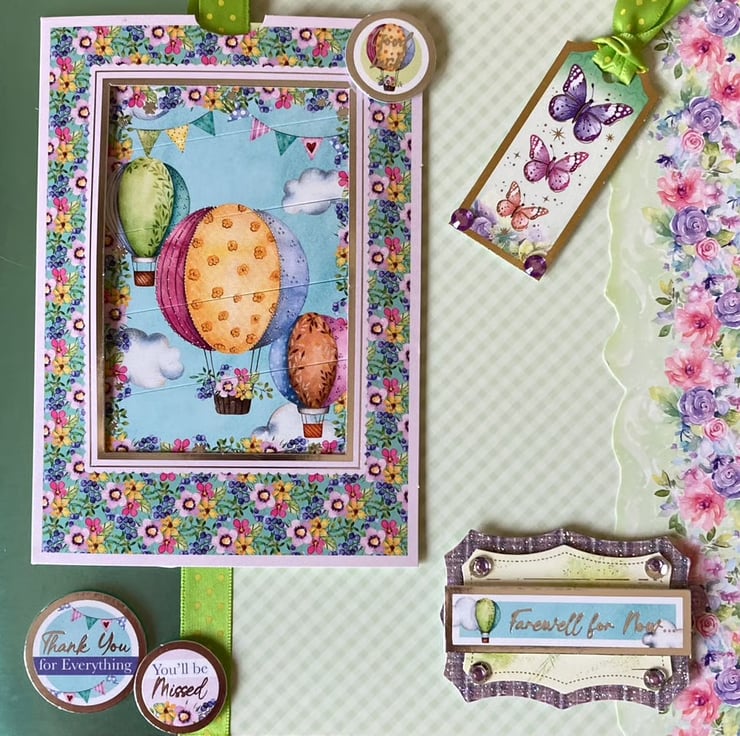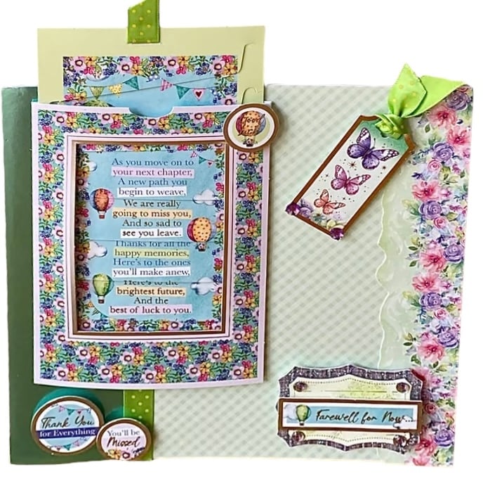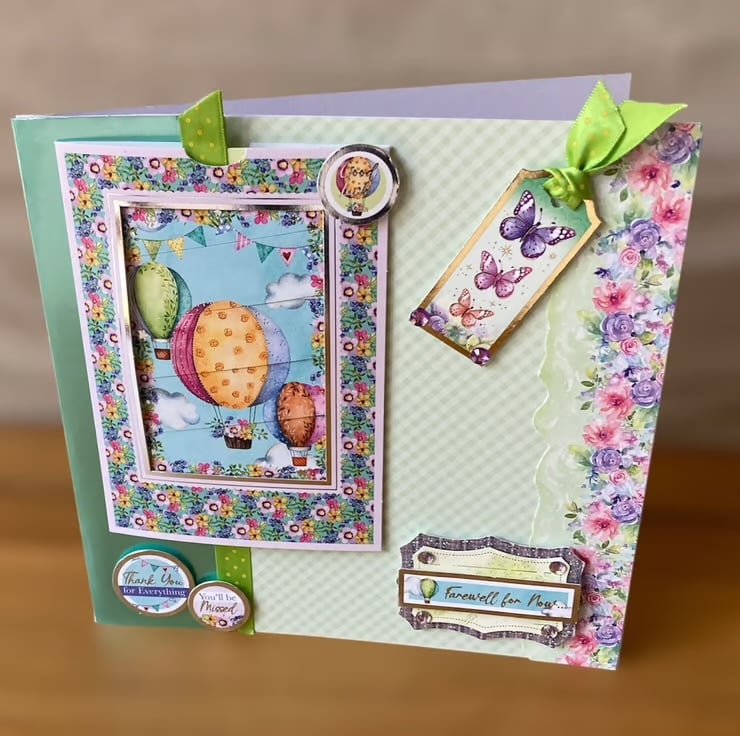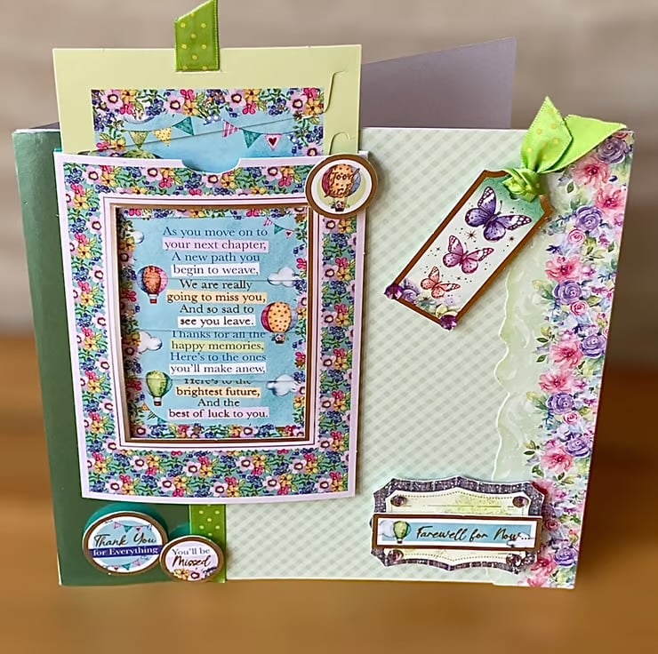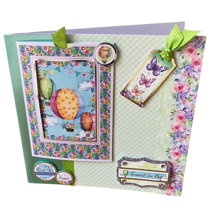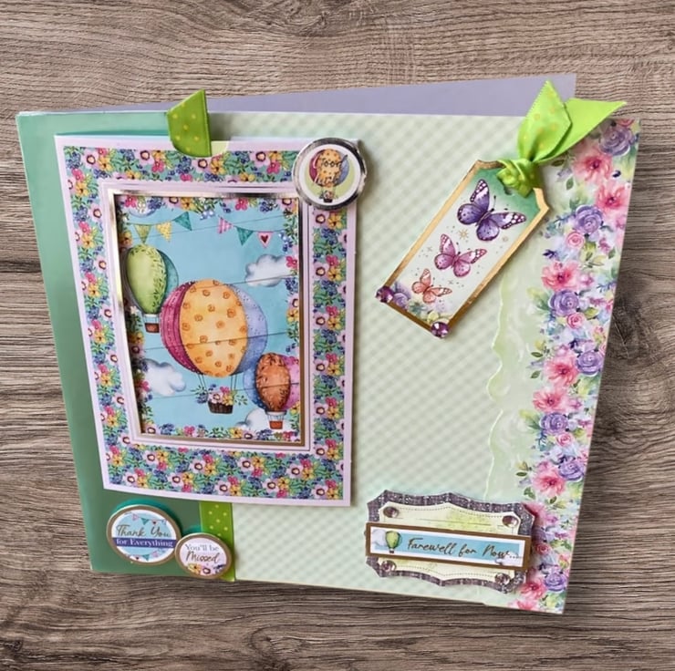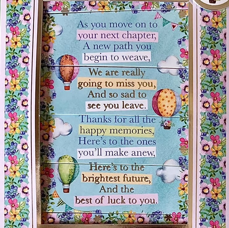 Beautiful hot air balloon rhyming reveal card perfect for someone who is leaving and moving on to pastures new.