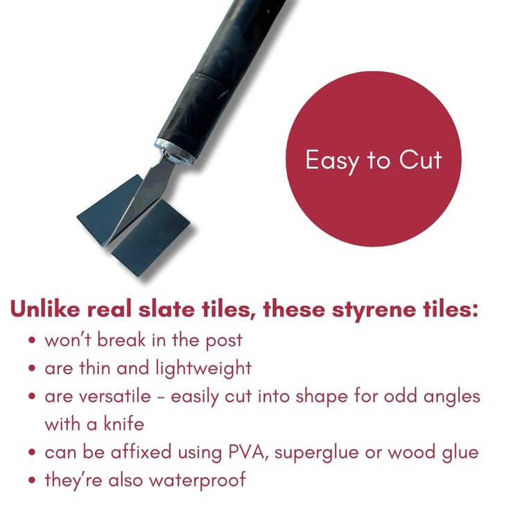 These 1:12th Scale Miniature Model, Dollhouse Angled Ridge Roof Tiles will bring your dollhouse, scale modelling, and diorama projects to life. Unlike real slate tiles, these styrene tiles won’t break or snap. To affix, leave a 1/2mm gap between the tiles and then fill with craft putty (grey), giving an authentic finish.