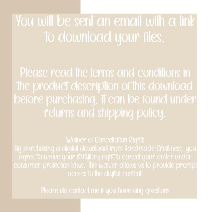 No Refunds for Digital Downloads Refund Policy for Digital Downloads Acceptance of Terms By completing your purchase, you acknowledge and accept this refund policy. At Handmade Craftiness, we are committed to providing high-quality digital products. Please read our refund policy carefully before making a purchase: Waiver of Cancellation Rights By purchasing a digital download from Handmade Craftiness, you agree to waive your statutory right to cancel your order under consumer protection laws. This waiver allows us to provide prompt access to the digital content. No Refunds After Download For digital downloads, consumers are required to waive their cancellation rights before the digital content can be provided. This means that once a customer (i.e., the consumer) has downloaded the content, they have given up their consumer rights to a refund. This policy aligns with consumer law for digital goods, ensuring the protection of intellectual property and preventing unauthorized distribution. Cancelling a Digital Download Under the Consumer Contracts Regulations 2013, digital downloads are neither goods nor services, meaning the law is a little different. If you want to download something within 14 days of buying it (known as the 'cooling-off’ period), you must give your consent to waive the 14-day cooling-off period. If you do not give your consent, the 14-day cooling-off period still applies. However, you will not be able to download your digital content until this period has ended. This policy exists to prevent customers from changing their minds after downloading the content. As you are being sent a link via email to download after purchase this will count as downloading the content as you will have access to download the files from the email. Eligibility for Refunds Refunds may only be issued under exceptional circumstances, such as: The digital content is proven to be defective or incomplete. An error on our part (e.g., duplicate billing). Contact Us If you believe you are eligible for a refund due to one of the exceptional circumstances above, please contact us at orders@handmadecraftiness.co.uk with your order details, a description of the issue, and proof of purchase. Our team will review your request and respond within 7 business days. For further inquiries, please contact us at orders@handmadecraftiness.co.uk. ------------------------------------------------------------------------------------------------------------------------------------------------------------- Ownership and Usage: All artwork within this shop is the exclusive property of Handmadecraftiness. You are expressly prohibited from reproducing, altering, redistributing, reselling, or claiming ownership of any digital item from this store. However, you are permitted to incorporate products from this store into your own physical handmade items for sale as a hobbyist. TERMS OF USE 1. You may print and use these items in a tangible journal/scrapbook/craft project etc. 2. You MAY NOT sell or share these files. 3. You MAY NOT reproduce/alter/redistribute our designs as a digital or physical item. 4. You MAY NOT sell or manipulate these files for resale purposes. 5. You MAY NOT share these files individually or as kits.