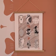 Design features objects commonly used in preparing Japanese green tea, matcha, including a tea pot, bamboo whisk, and chashaku spoon. I enjoyed creating a common design across these individual components which include a fern and abstract brush mark design.