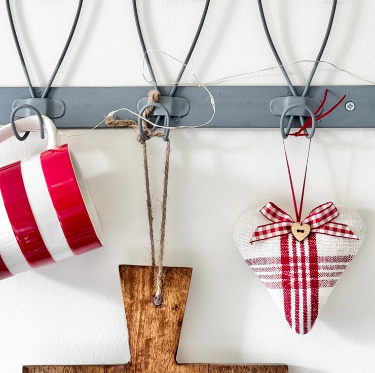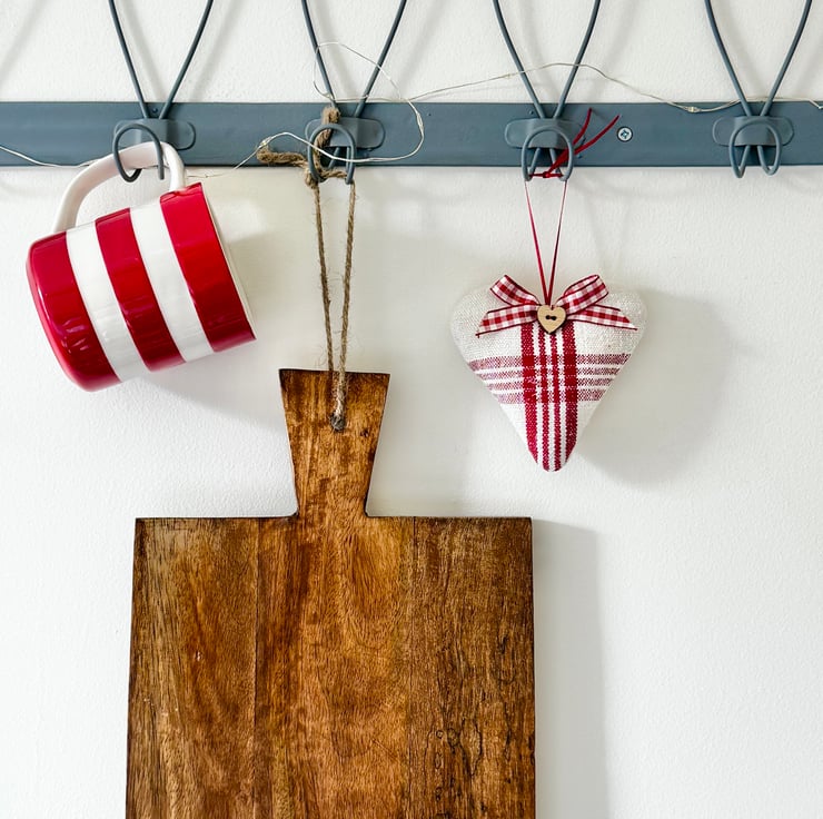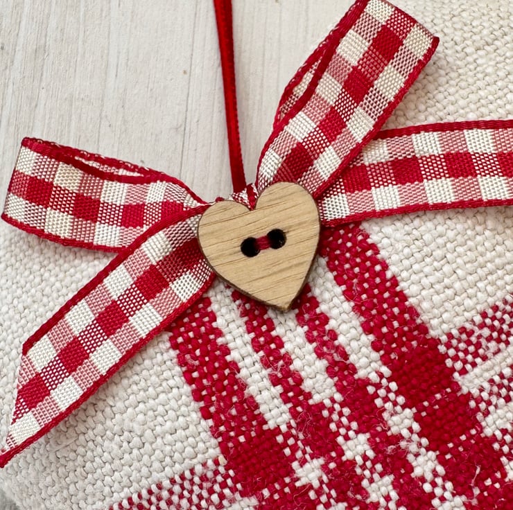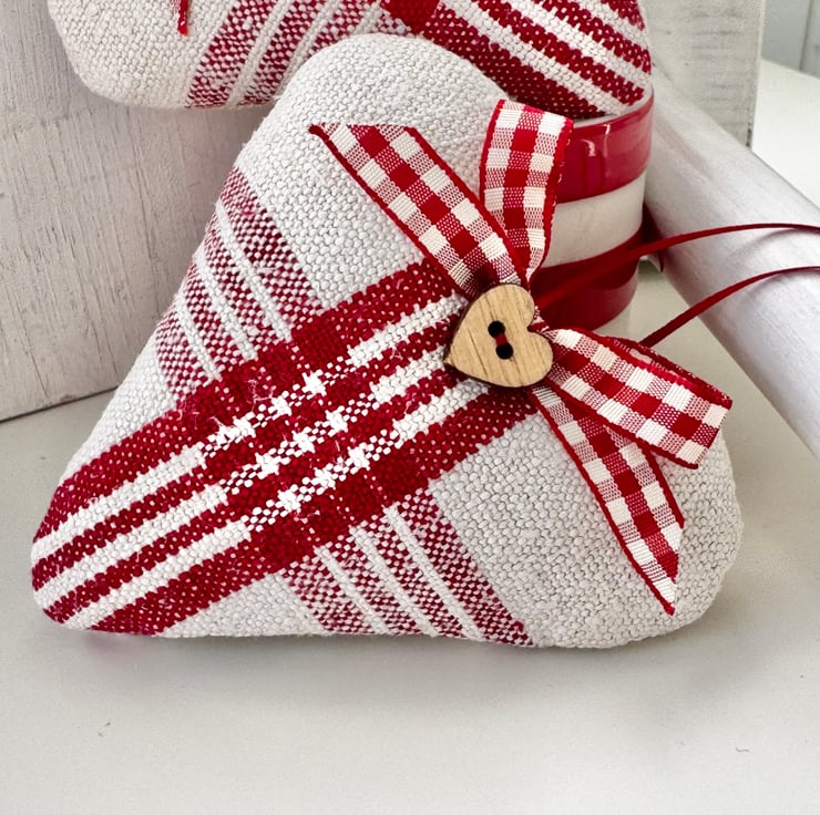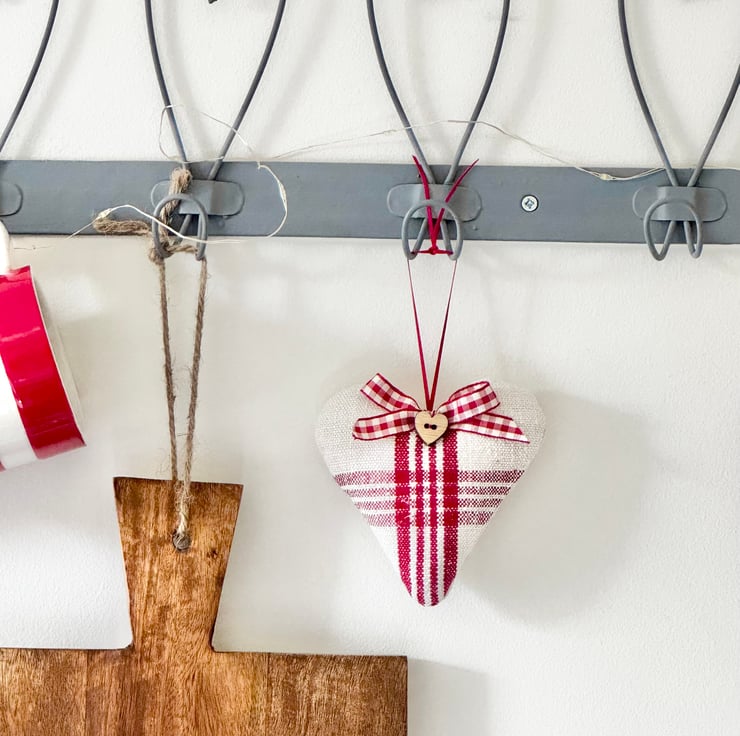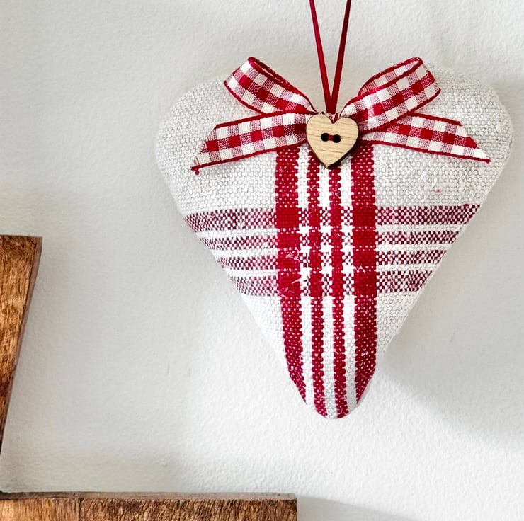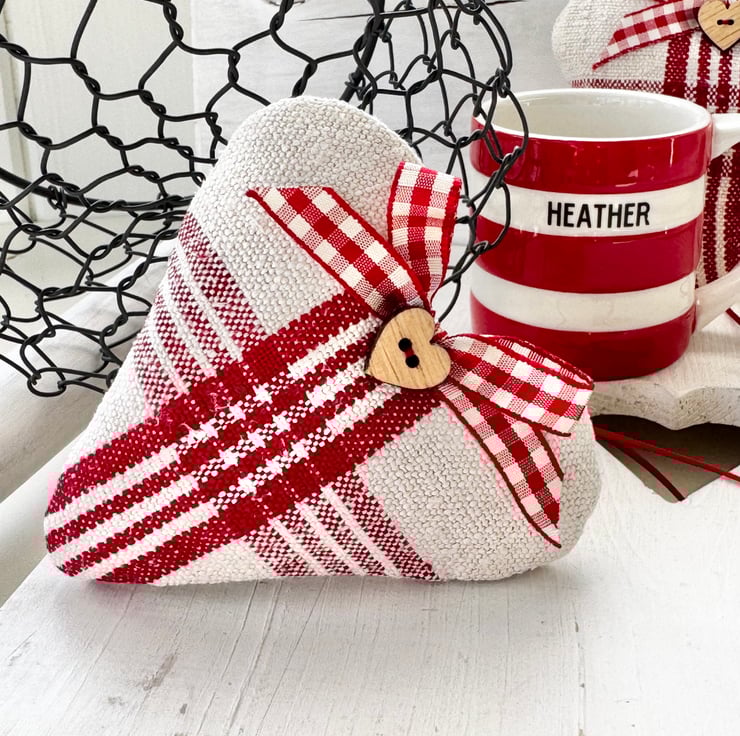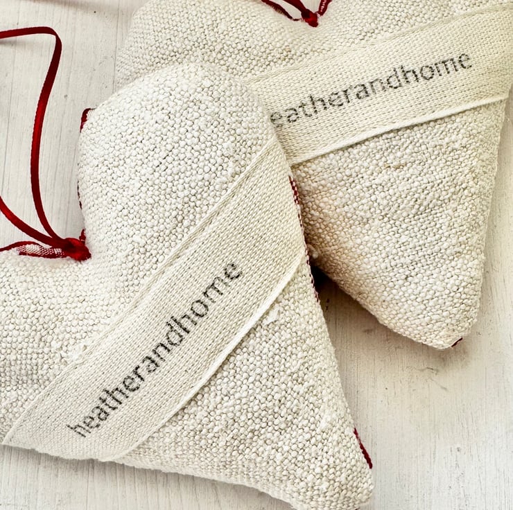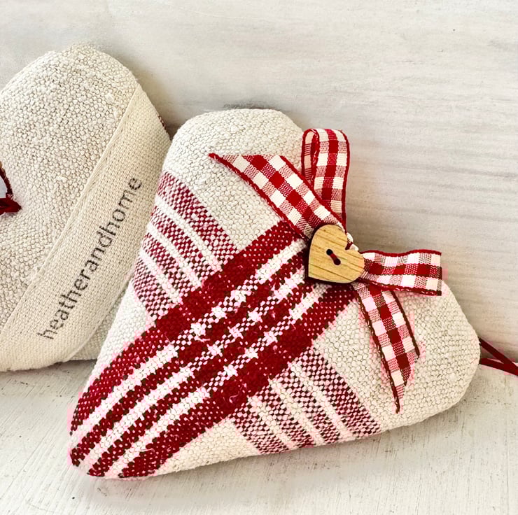 Filled to the brim with super fragrant Hampshire lavender, and beautifully finished with a delightful heart-shaped wooden button, a red and white gingham ribbon bow, and narrow-width red satin ribbon hanging ties. The reverse side of the heart is in plain creamy-white grainsack linen with a delicately printed 'heatherandhome' cotton label.