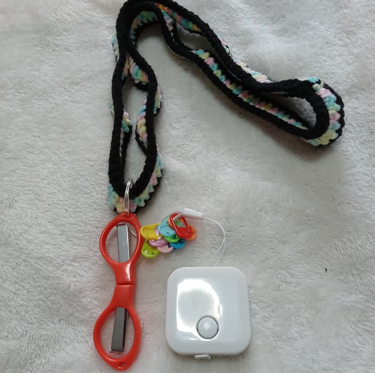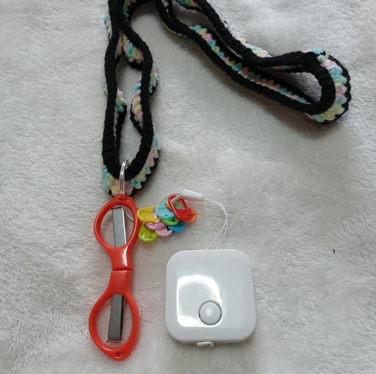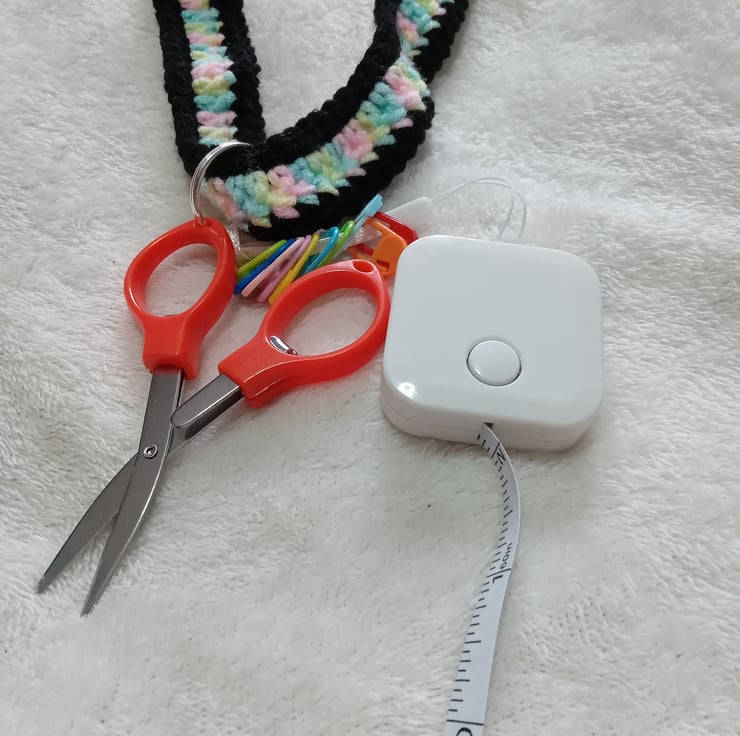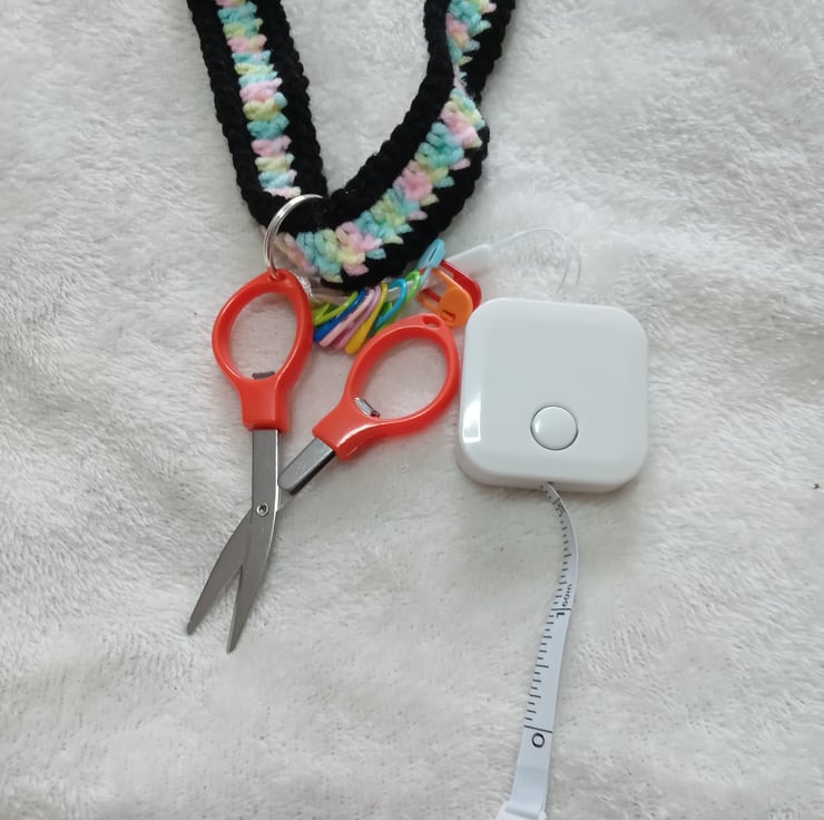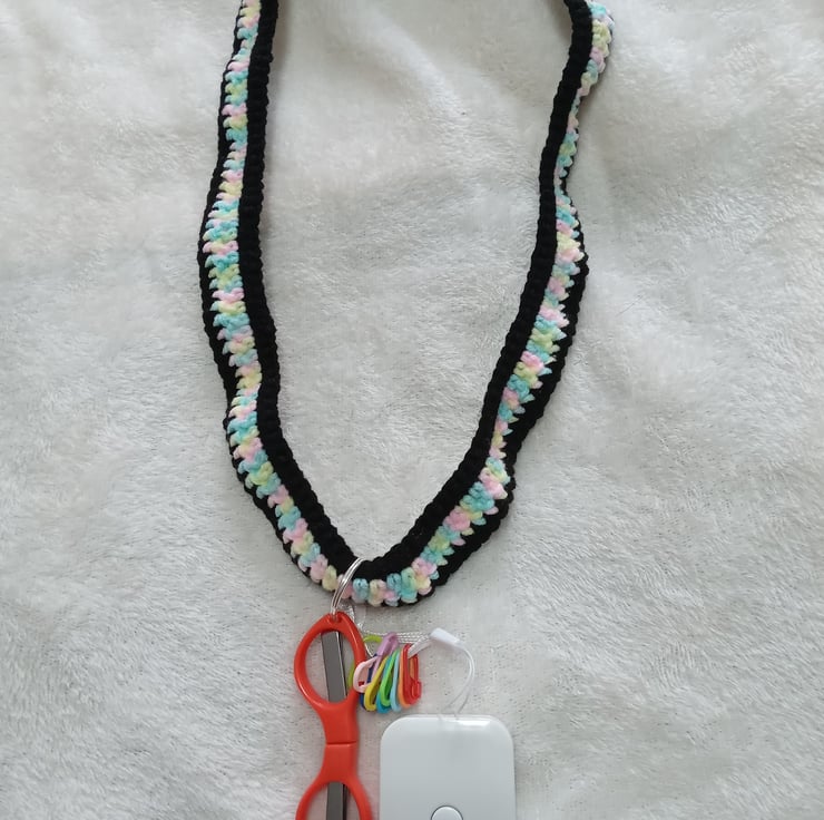 crochet neck strap multi coloured and black with crochet accessories attached