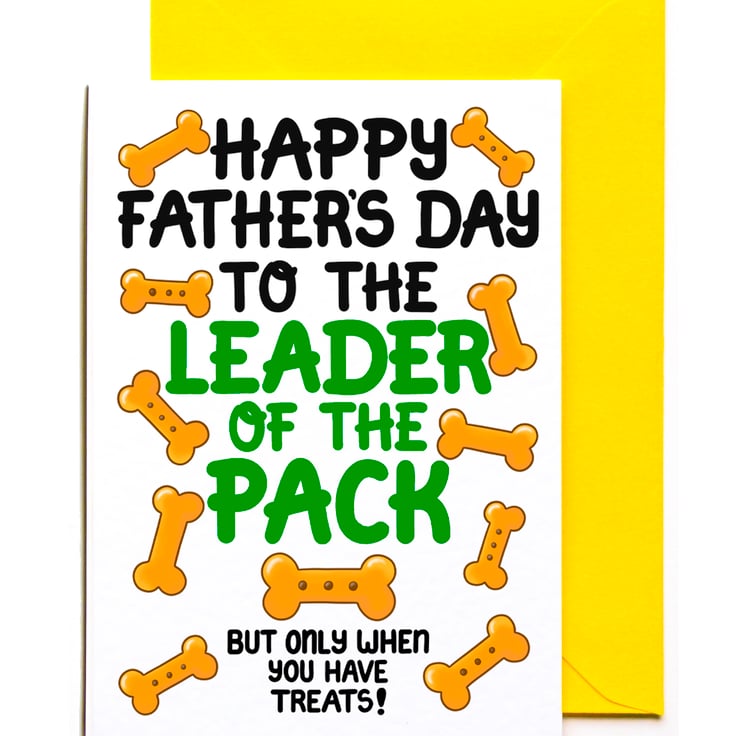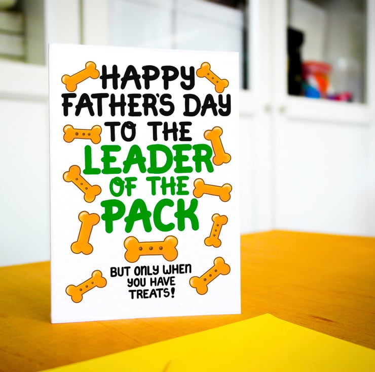 Greeting on front:HAPPY FATHERS DAY TO THE LEADER OF THE PACK BUT ONLY WHEN YOU HAVE TREATS