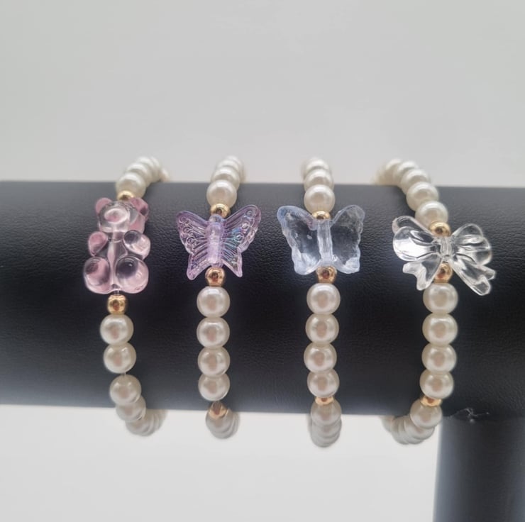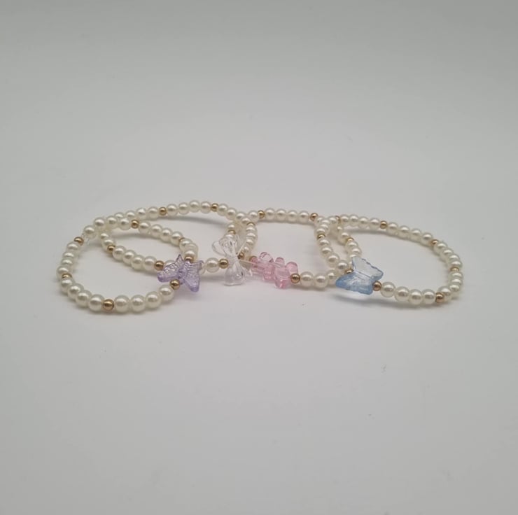 These White Pearl Beaded Bracelets have white pearl beads along with small gold beads. They also have a random charm in the middle which comes in the options blue, purple, pink or transparent. They come in an organza bag, which will be in an envelope.