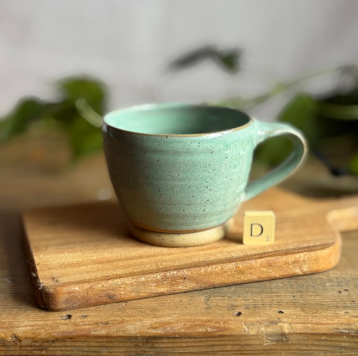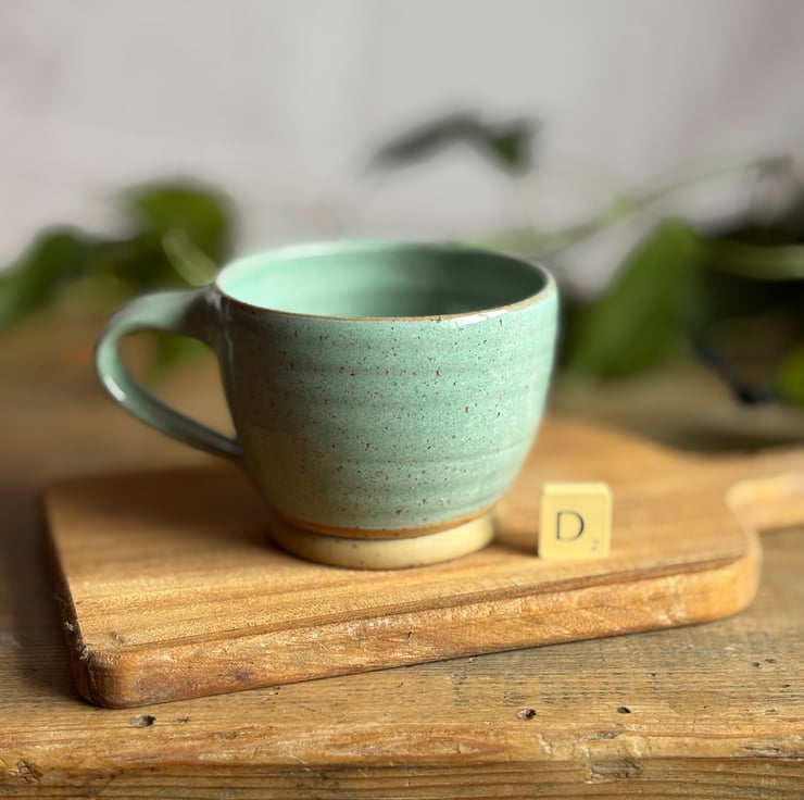 A large pottery mug made from a beautiful speckled toasty clay and finished in a glossy pale turquoise glaze allowing the speckles in the clay to show through.