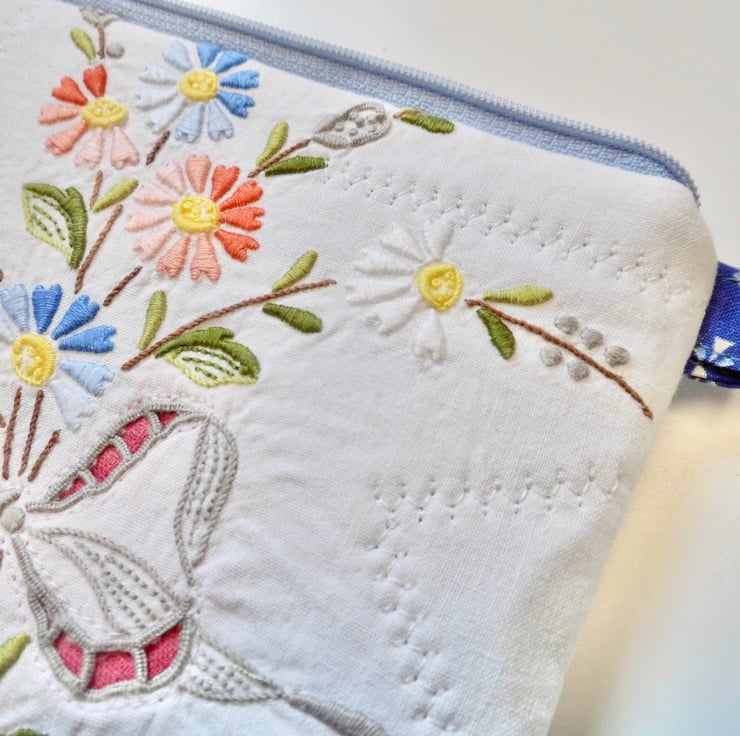 I made this make up bag using fabric salvaged from a vintage hand embroidered tablecloth which was no longer fit for purpose. The embroidery features delicate sprays of flowers with decorative cut work and drawn thread work. I began by backing the cut work with dark pink fabric and then backed the fabric with fusible fleece, adding rows of machine quilting stitches for stability and extra body. The back also features a touch of the reclaimed embroidery.