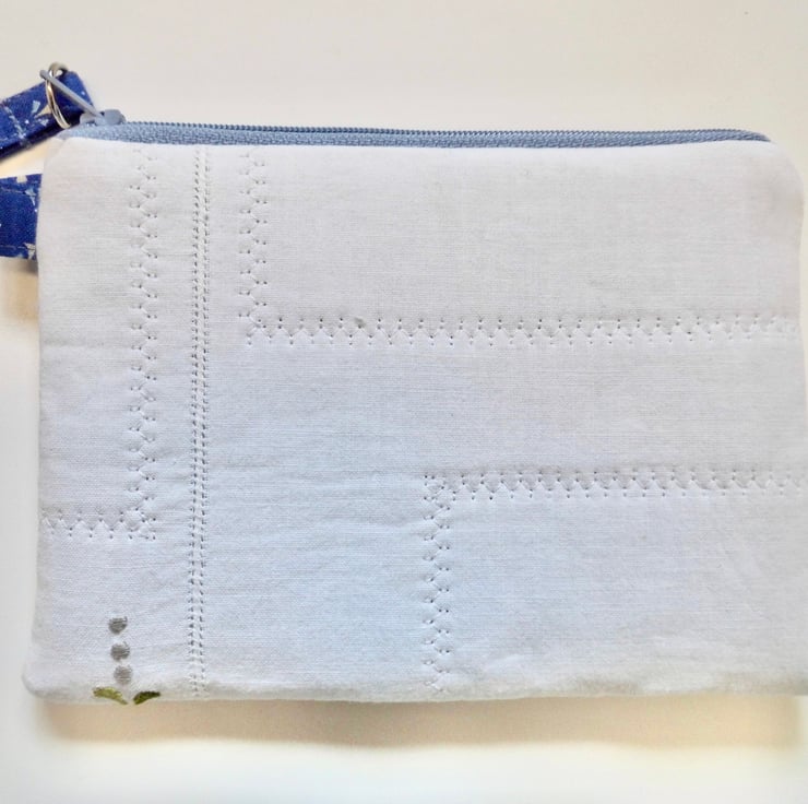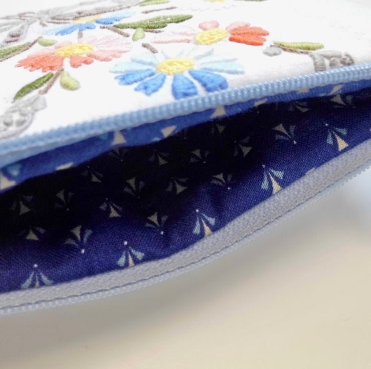 Lined with a beautiful Laura Ashley vintage print in navy blue. It has a light blue/grey zip across the top which is finished with a fabric tab, with a fabric loop inserted into one side in case you want to add a charm, strap or key ring.