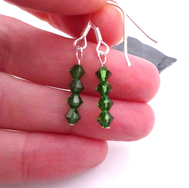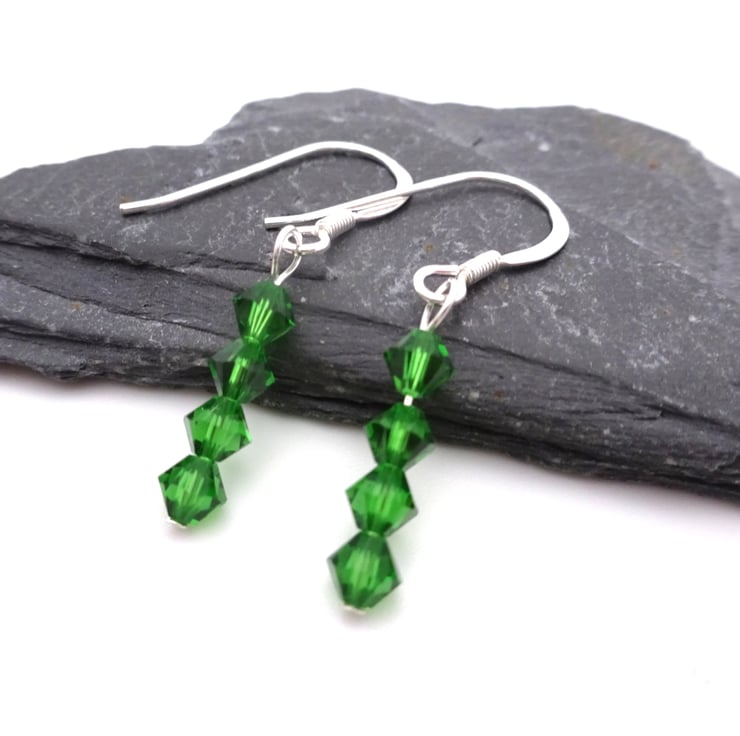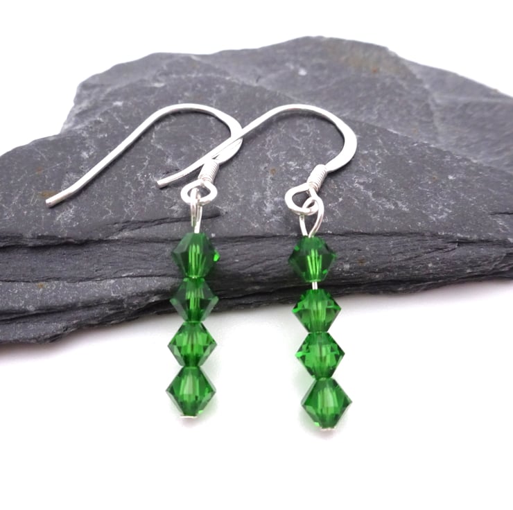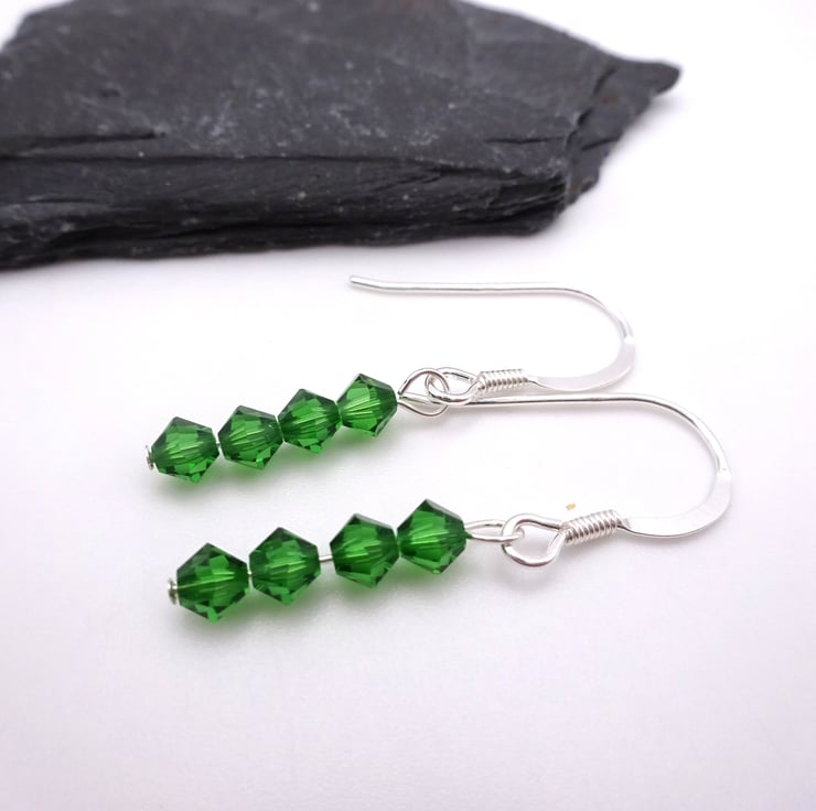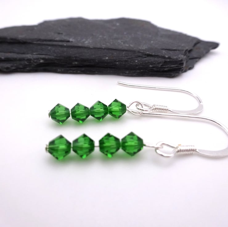 A pair of sterling silver earrings made with emerald green crystals to represent emeralds.