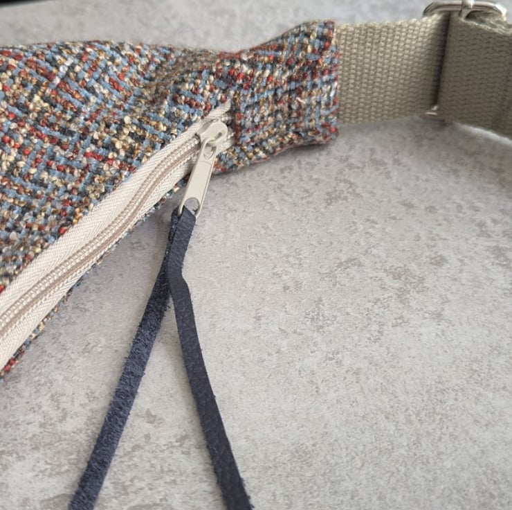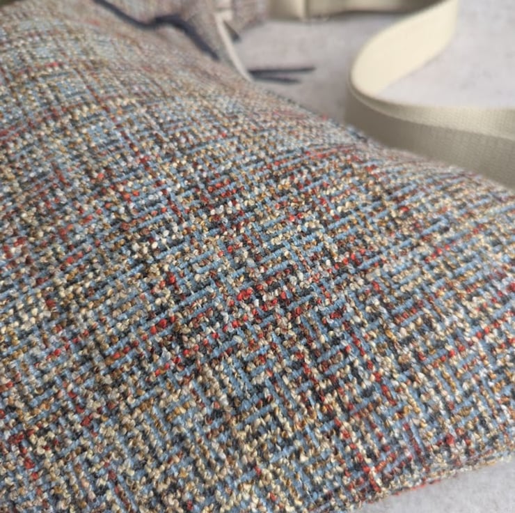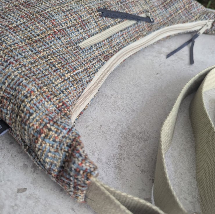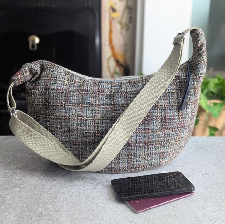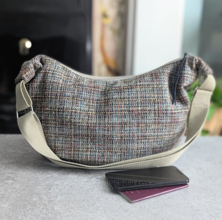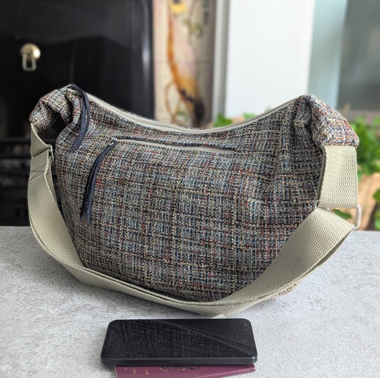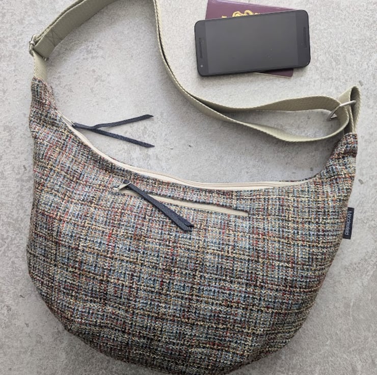 Handmade using woven upholstery fabric remnants, this cross body large dumpling shaped bag has been designed to be light and casual with a contemporary vibe.