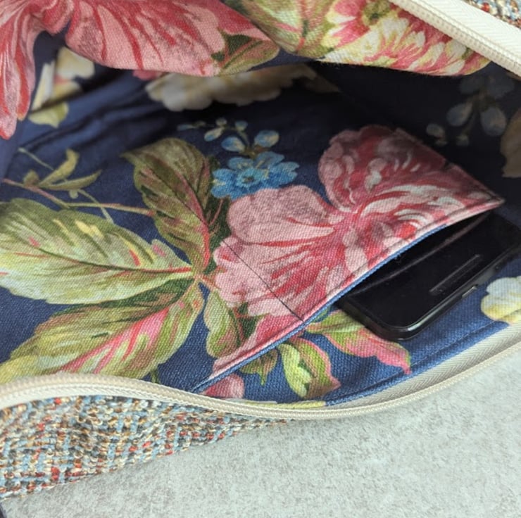 Inside, it's lined with a floral print soft furnishing fabric and has a divided slip pockets for phone, pens etc. The outside of the bag has a deep zipped pocket. There is an additional key fob inside.