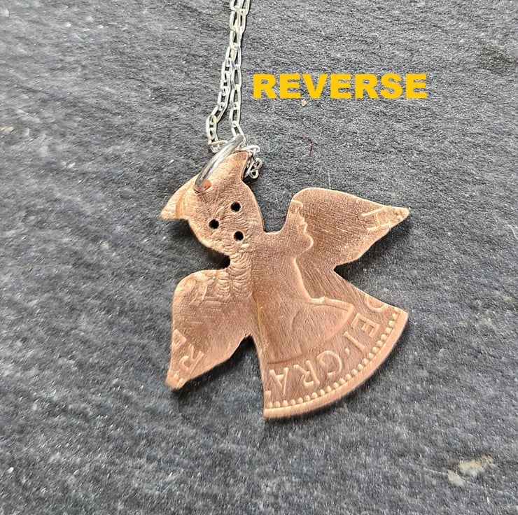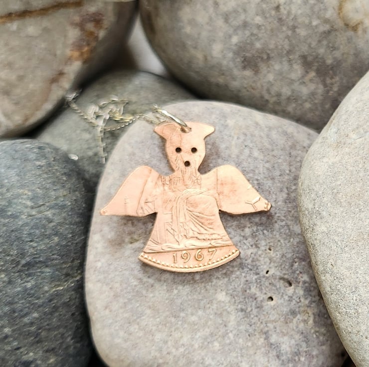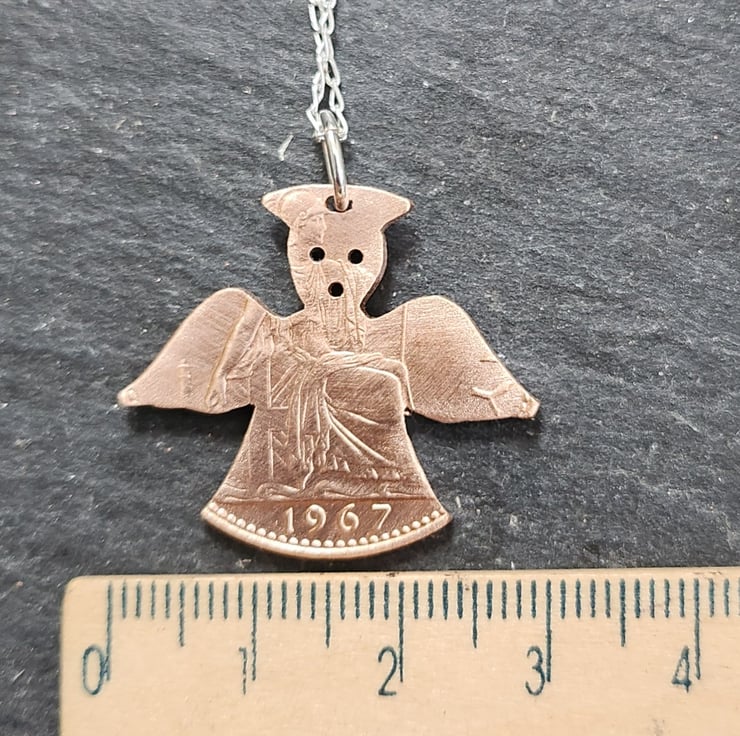 A 1967 bronze pre-decimal penny coin that has been handpierced with a fine-bladed jeweller's saw to reveal an angel with a halo. Approximately 2.5cms tall. This pendant comes with a sterling silver chain included in the price, 16 or 18 inch, you choose.