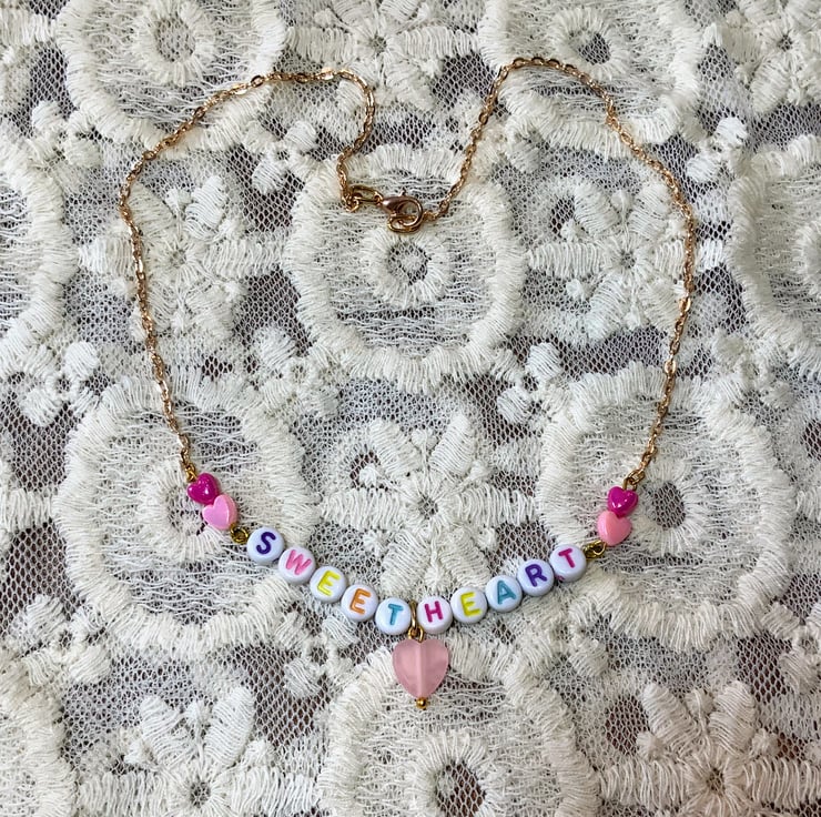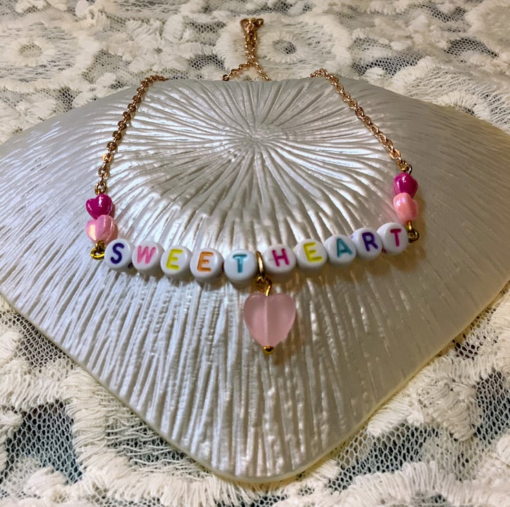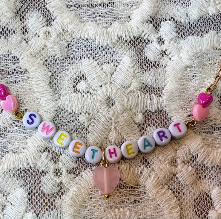 The letter beads spell Sweetheart in rainbow capital letters. Featuring a frost baby pink heart in the centre and mini shiny pink heart beads at the sides.