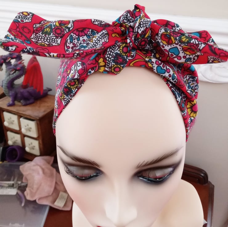 1950s Retro Rockabilly Headscarf  Bandana Handmade Red Sugar Skull Print