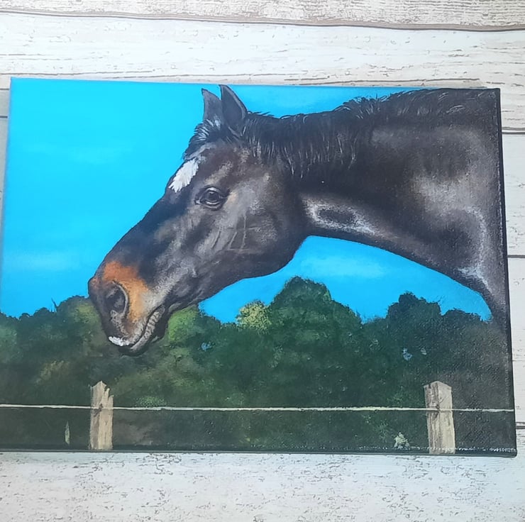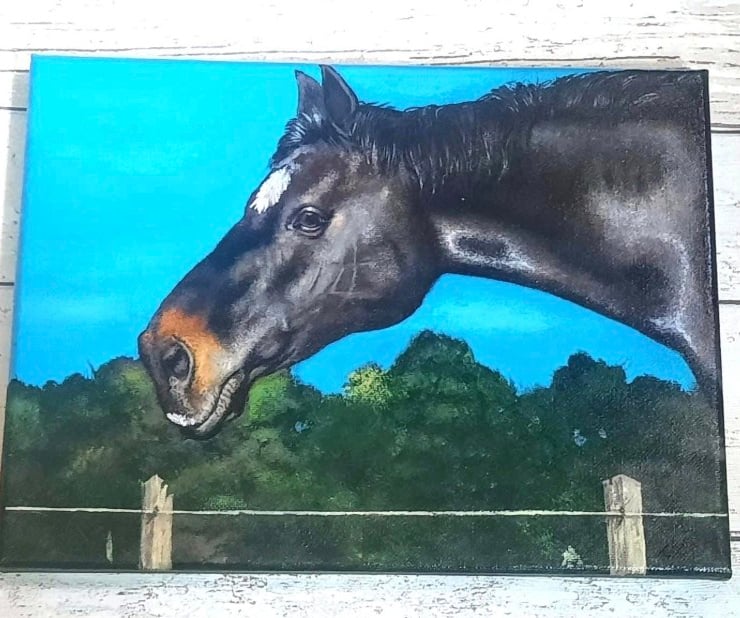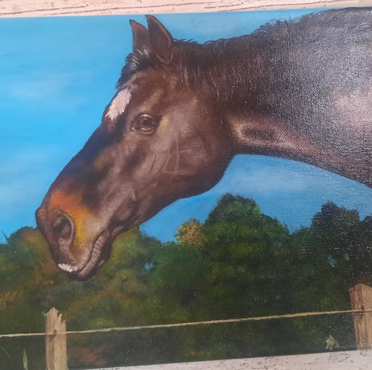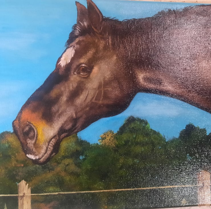 I love horses, I had painted a horse a few years ago and a buyer approached me with a beautiful story about her first experience petting a horse and my horse painting brought all the feelings back, so I wanted to paint another horse but also one that would trigger those feelings of wanting to touch it. I chose to paint this horses ultra glossy coat.
