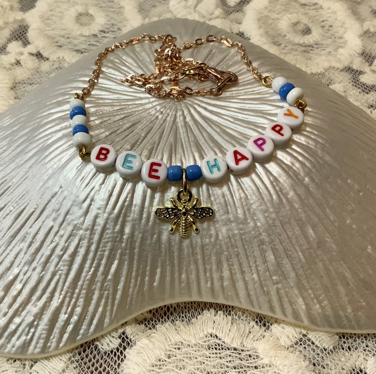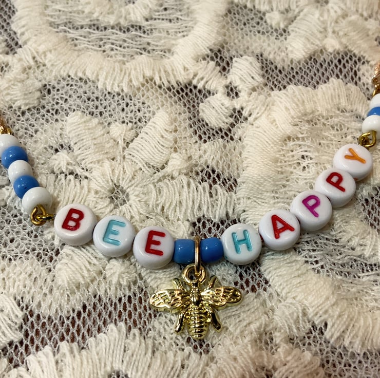 The letter beads spell 'Bee Happy' in rainbow capital letter beads. Featuring a gold metal bumble bee charm in the centre.