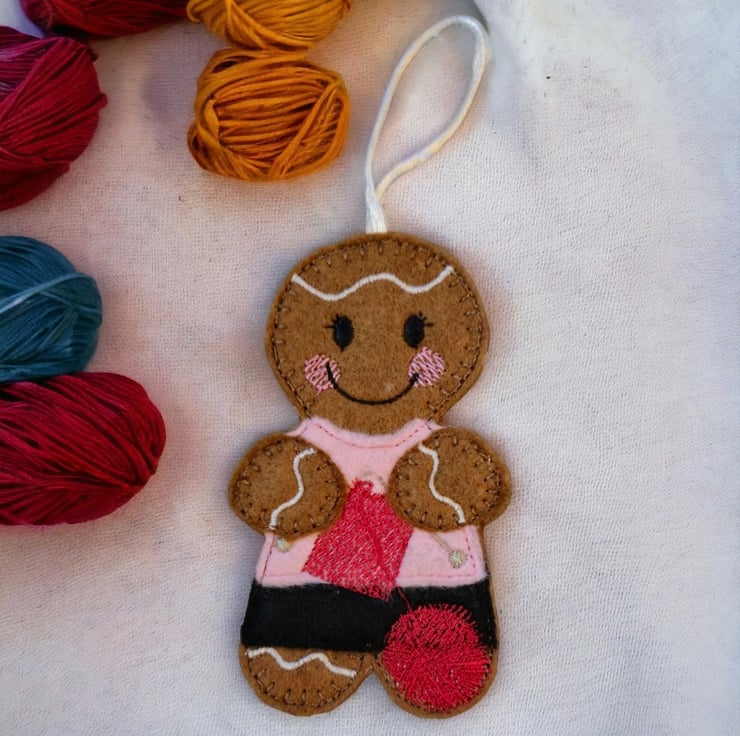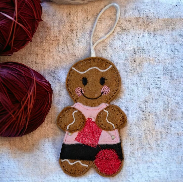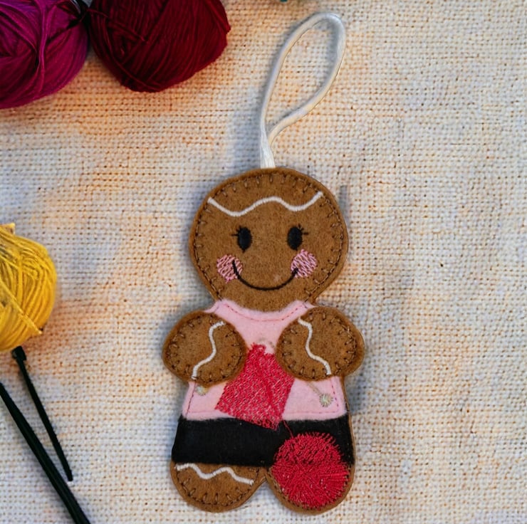 Gingerbread lady doing some knitting Embroidered Hanging Keepsake
