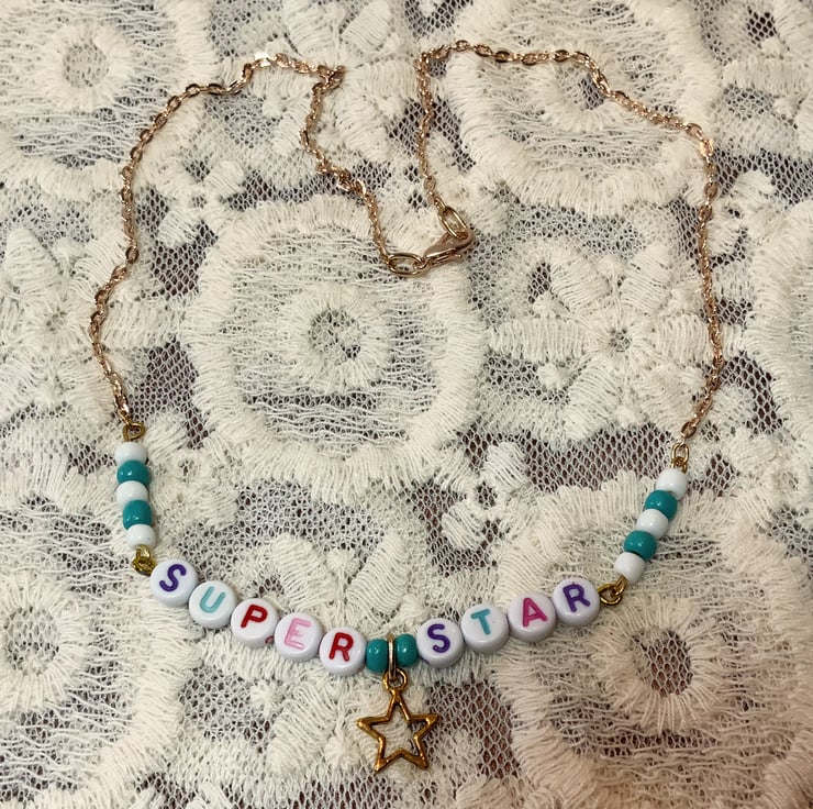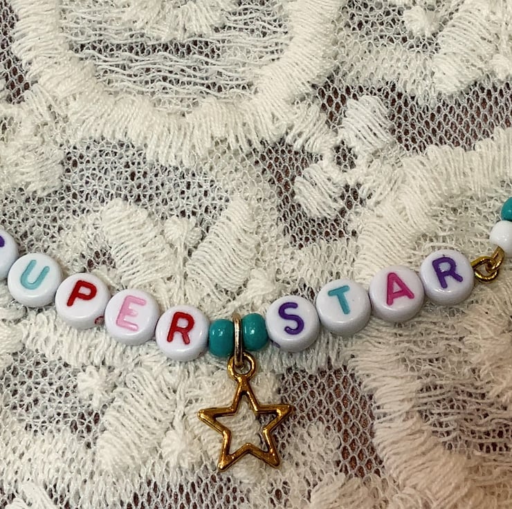 The letter beads spells 'Super Star' in rainbow capital letter beads. Featuring a gold metal star charm in the centre.