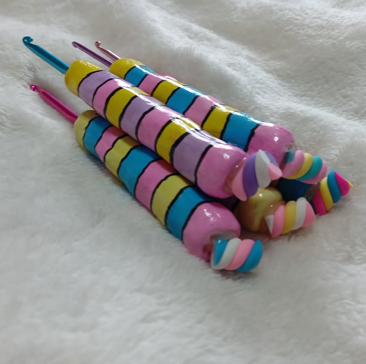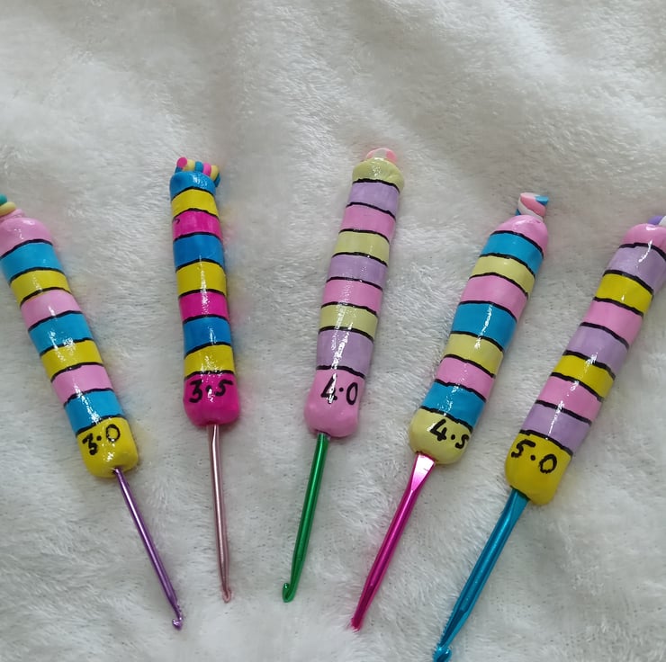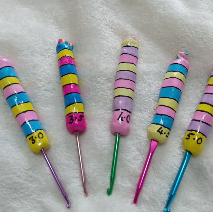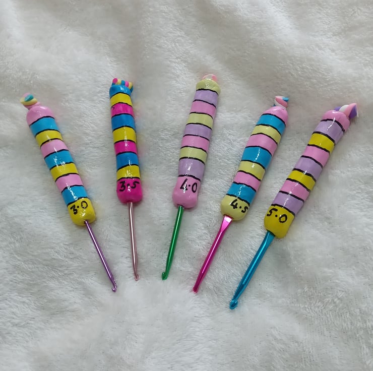 set of 5 crochet hooks made with airdry clay and hand painted with top of glossy varnish and flump charm on the top.