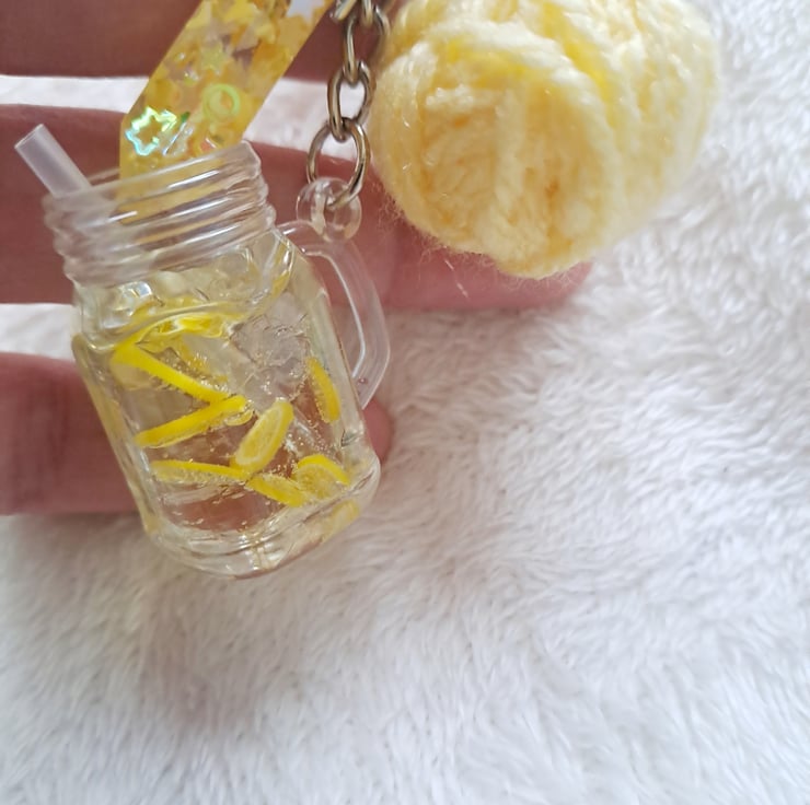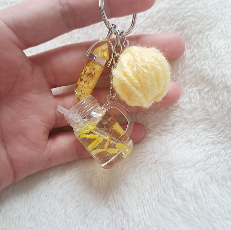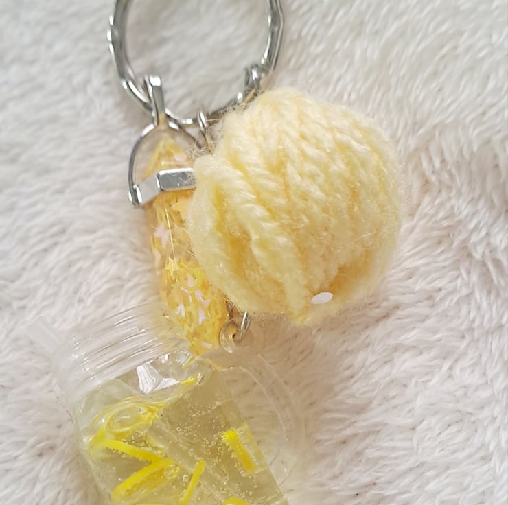 lemon cocktail keyring with charm and wool ball. crochet, knitting inspired