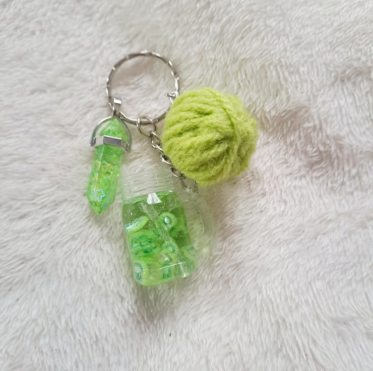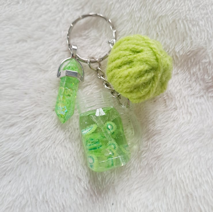 kiwi cocktail keyring with charm and small wool ball knitting crochet insipied