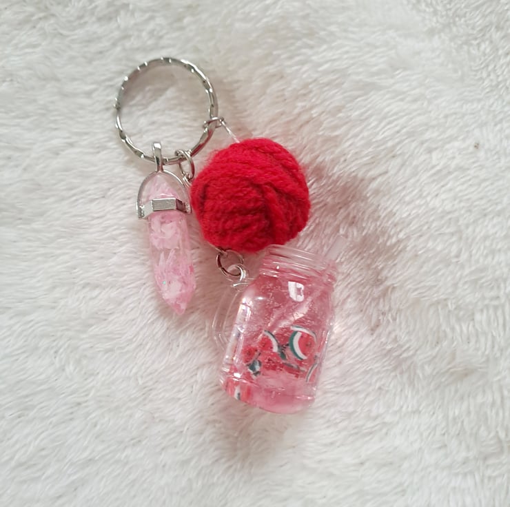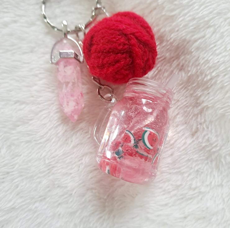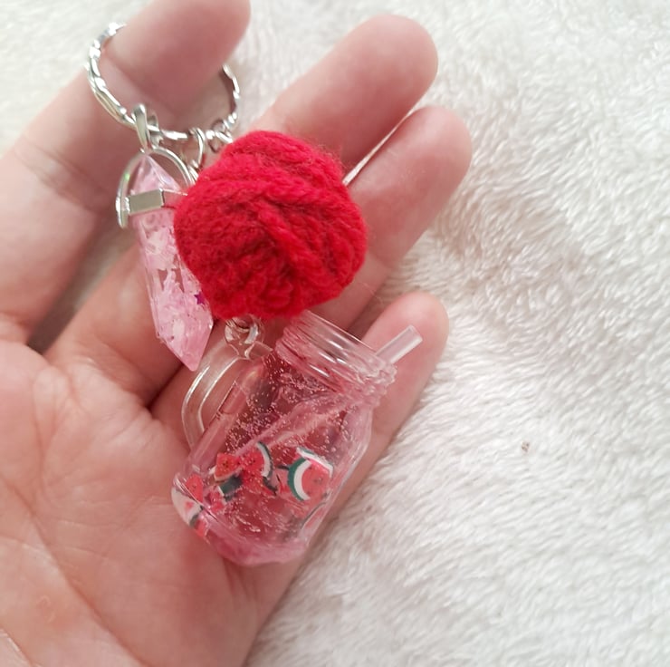 watermelon cocktail keyring with resin charm and wool ball knitting crochet inspired