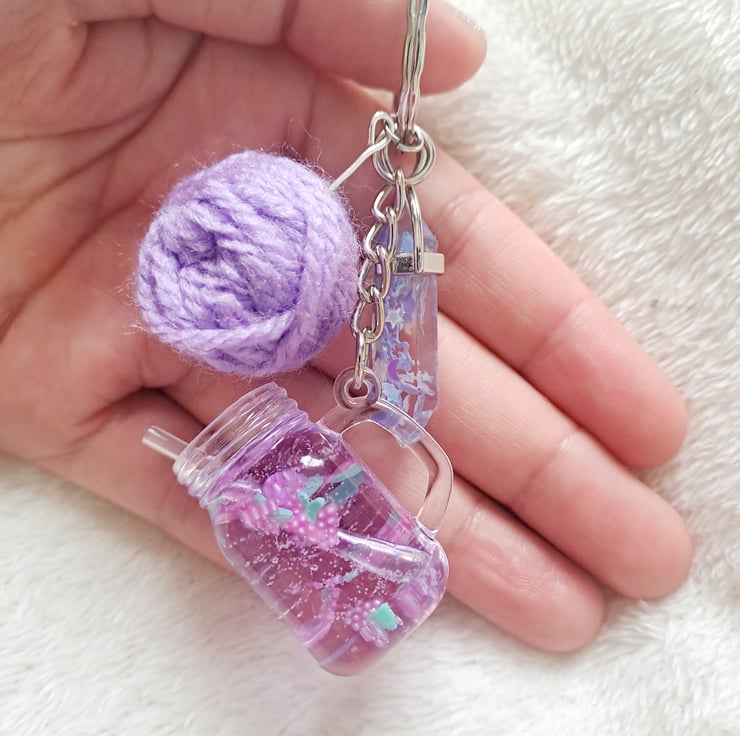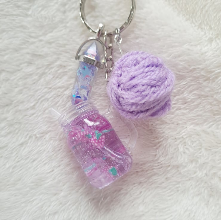 grape cocktail keyring with resin charms and wool ball crochet knitting inspired