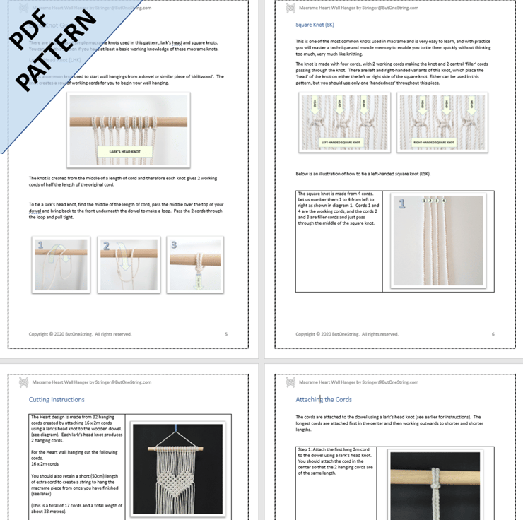 Designed and photographed by ButOneString. The PDF document contains detailed instructions, lists the materials needed, and a step by step guide to complete the project with colour photographs. Suitable for complete beginners, the pattern includes a basic knot guide and step by a step instructions.