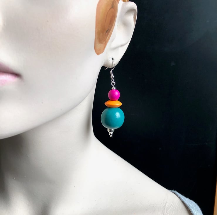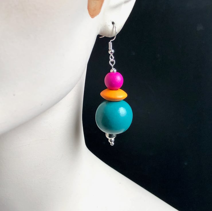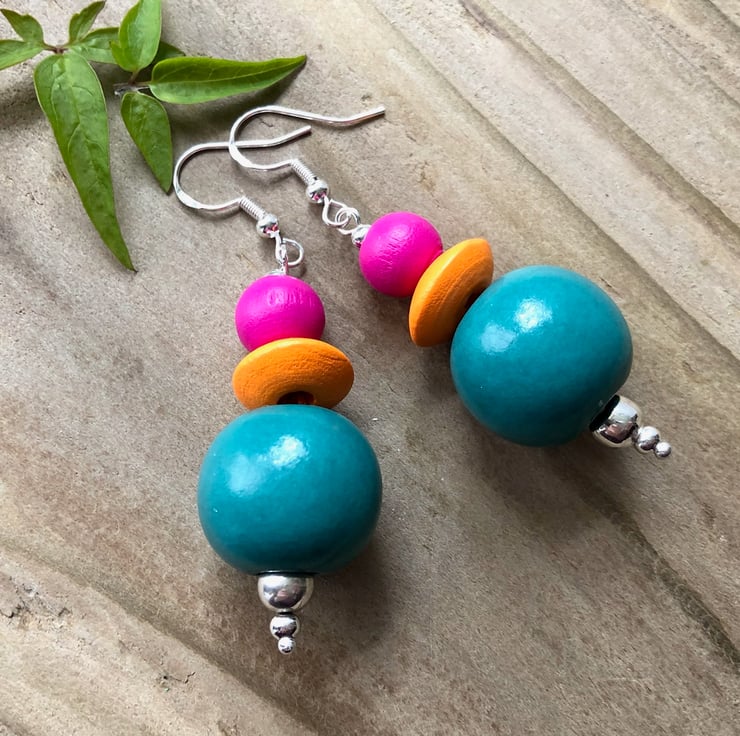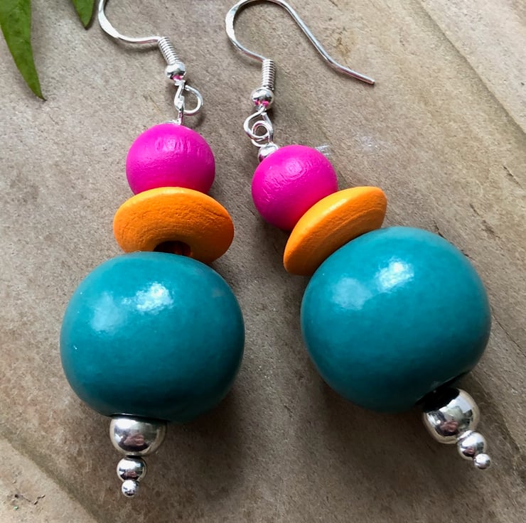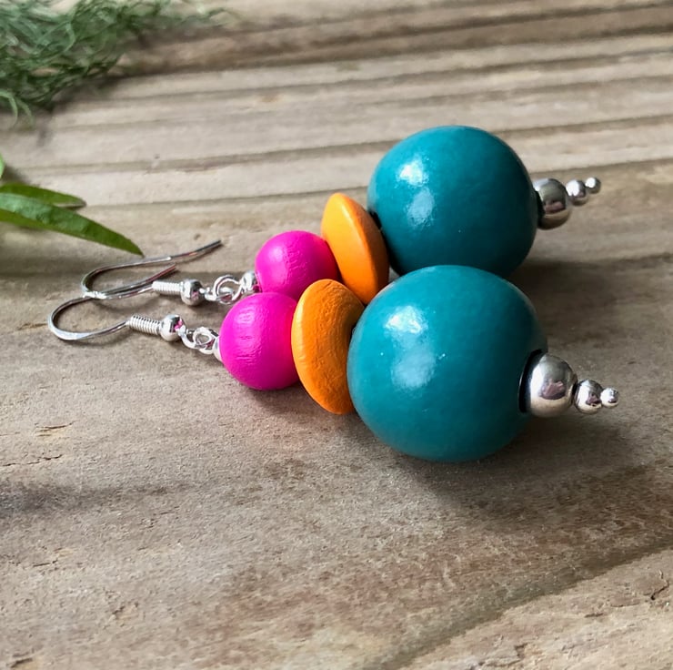 Lovely big dangly lightweight wooden bead earrings with 20mm dark teal green round beads, 14mm orange saucer beads and 10mm dark hot pink round beads.
