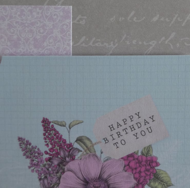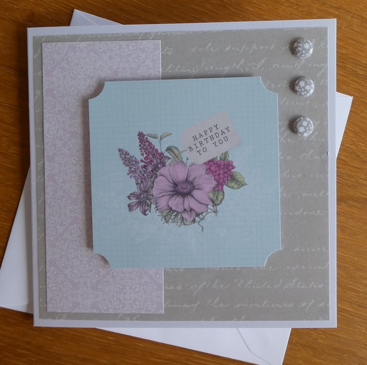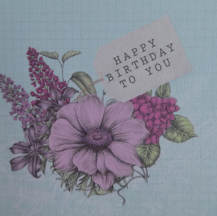 A central square topper with an image of pink and soft purple flowers on an aqua background has the message Happy Birthday To You. This has been raised from the background on foam pads.