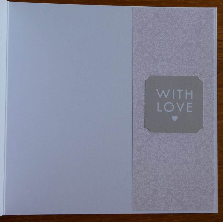 Inside the card is a strip of matching soft pink and white patterned paper with a square message with the words With Love. Plenty of space has been left for your own birthday message.