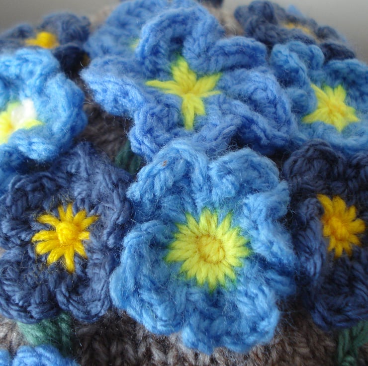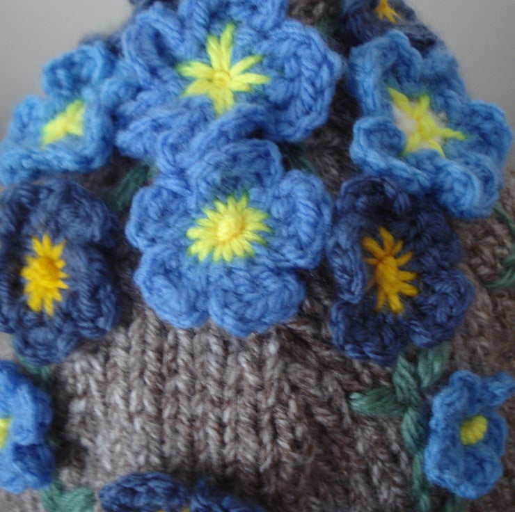 This is a hand made tea cosy for a four to six cup teapot. The base is knitted with a really thick Aran in light brown. The flowers are croched and finished of with crochet leaves and embroidered stems. I made this with the intention of donating 10% of the sales to the Alzheimer's Society in tribute to a friend.