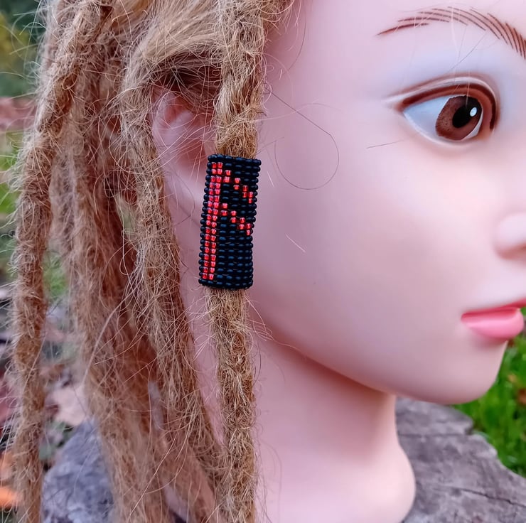 This handcrafted dreadlock bead is made with striking black and red seed beads, carefully created using locally sourced materials. Measuring approximately 3.5 centimetres tall, it is designed to fit dreadlocks or braids of different thicknesses, available in 7mm for pencil-thickness and 9mm for biro-thickness locks.
