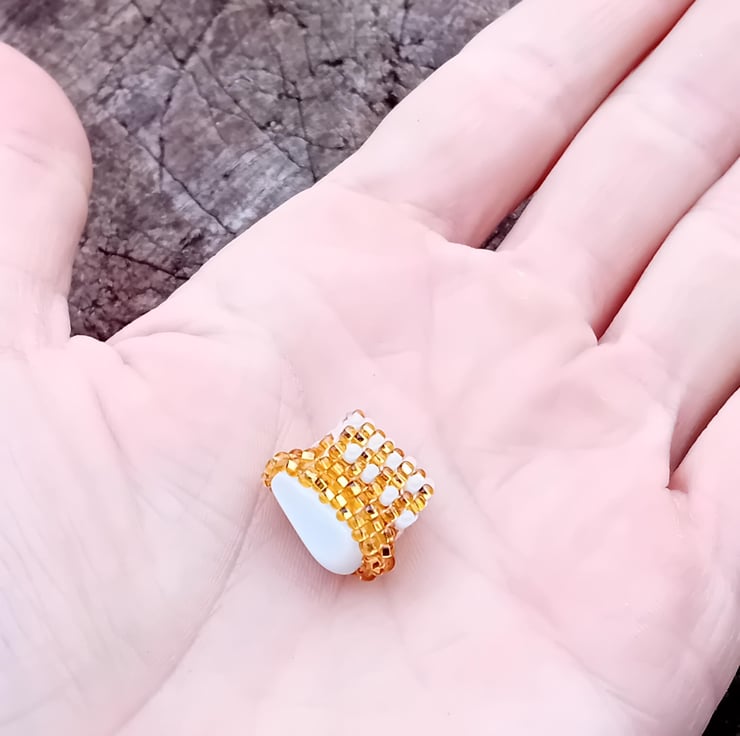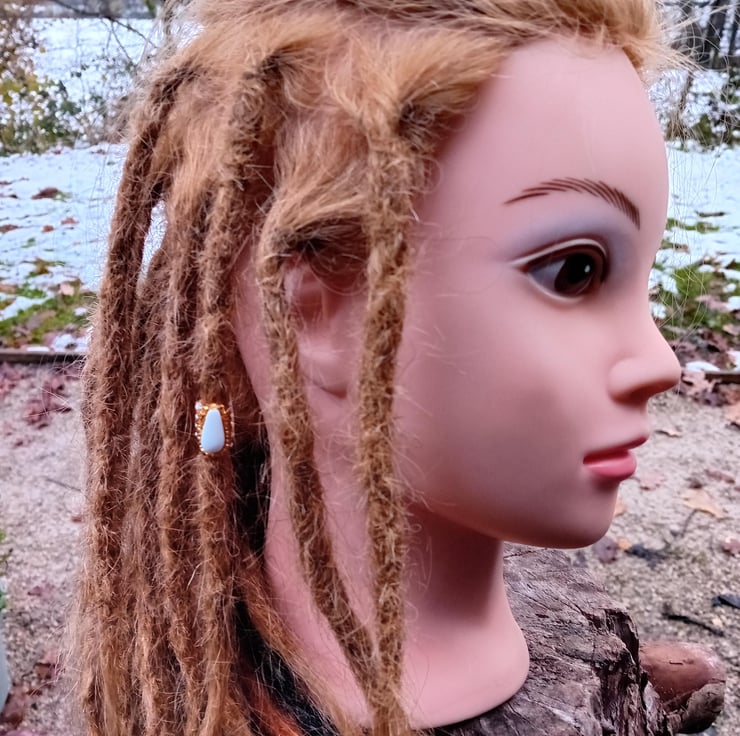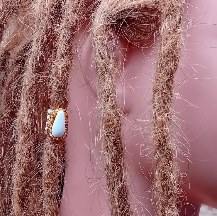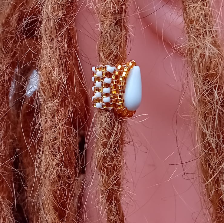 This tribal style witch-doctor vibe dreadlock bead is made lovingly with locally-sourced gold and white beads and lots of love