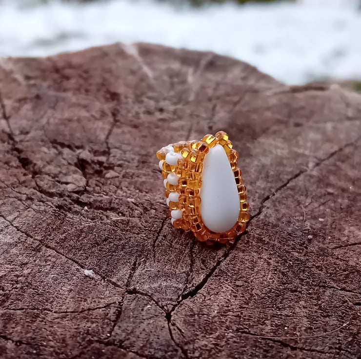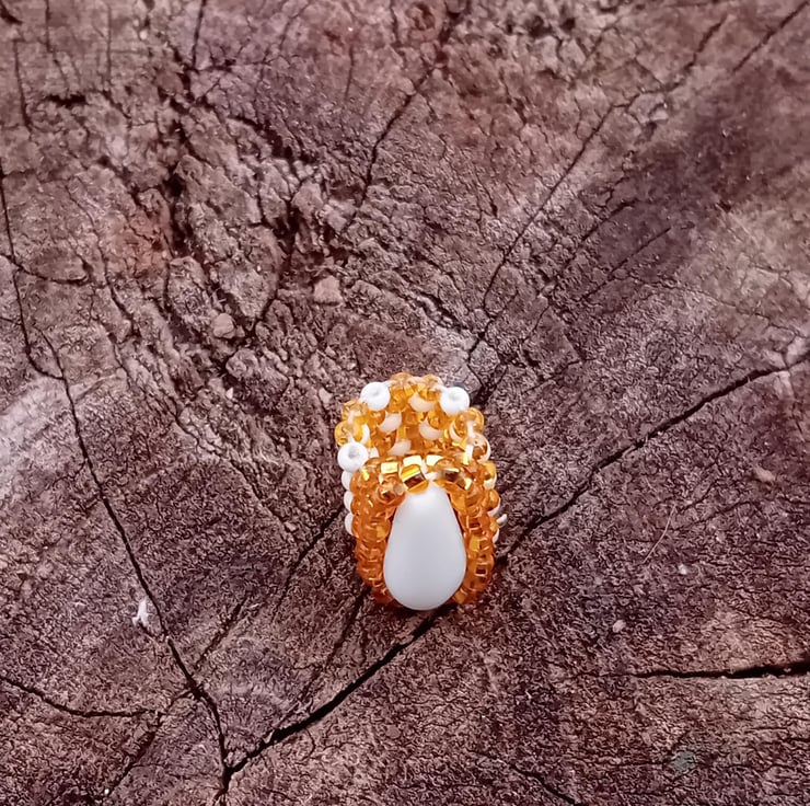 I have these white teardrop shaped ceramic like beads in my stash and I used one in a cool peyote style to create this regal and warrior-like bead.