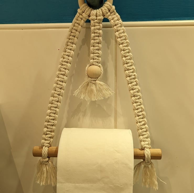 It features a wooden ring that can be hung from any type of hanging fixture and a wooden dowel on which to hang the toilet roll from. Its simple design allows you to easily replace toilet rolls by sliding one side of the macrame cord off the dowel and back on again.